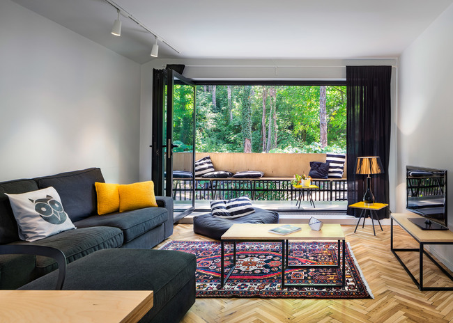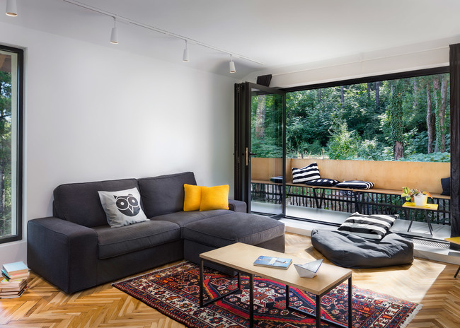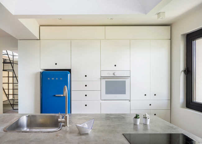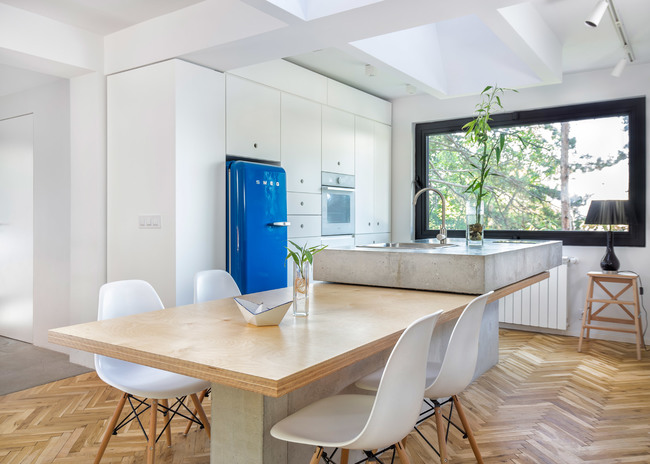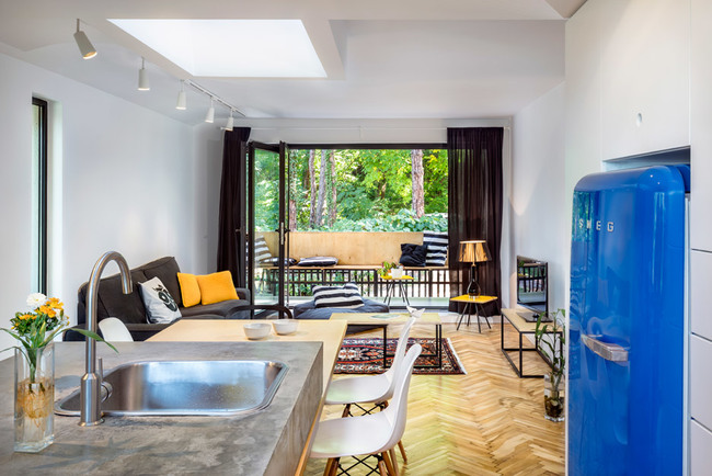 Голямото LED пано на тавана и насоченото осветление в хола са един от основните елементи, подчертаващи съвременната артистична визия на жилището. Ретро хладилник, в съчетание с бетонен плот и умивалник в инокс са част от очарованието на преходната кухня.