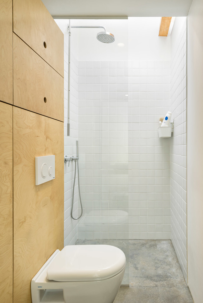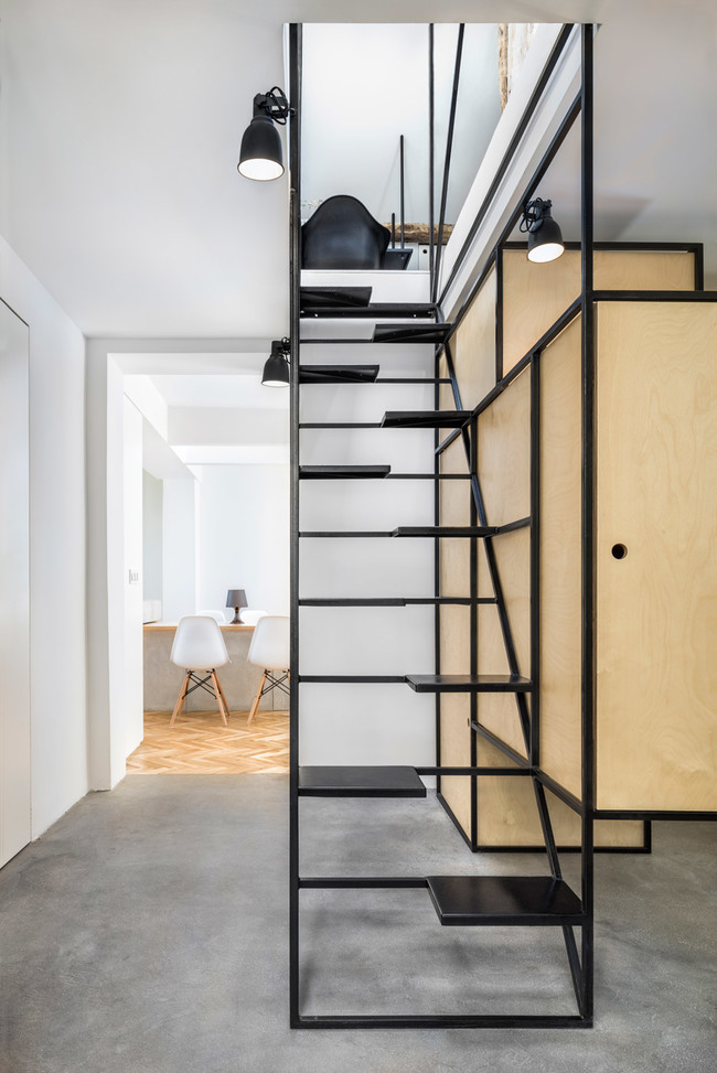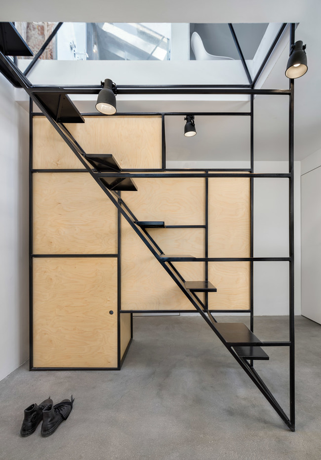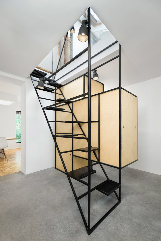 За да не бъде голо пространството, около този преход към горното ниво, създателите са запълнили площта с модули от шпертплатови плоскости, които функционират като шкафове, а малки дупки по периферията им позволяват лесното им отваряне. 20-милиметровите кухи стоманени греди се явяват отличен материал за изработката на предизвикателното стълбище с продължение.