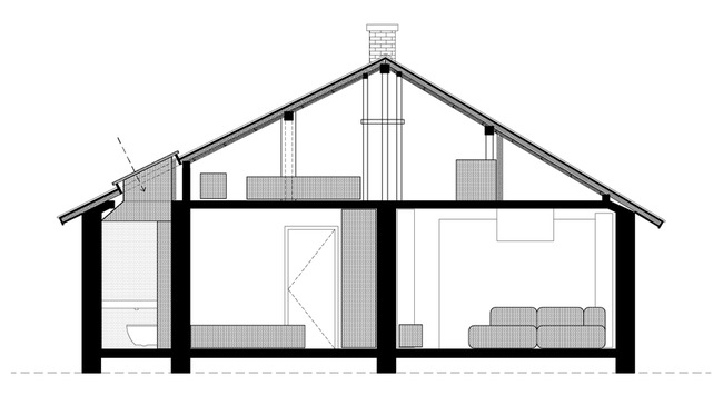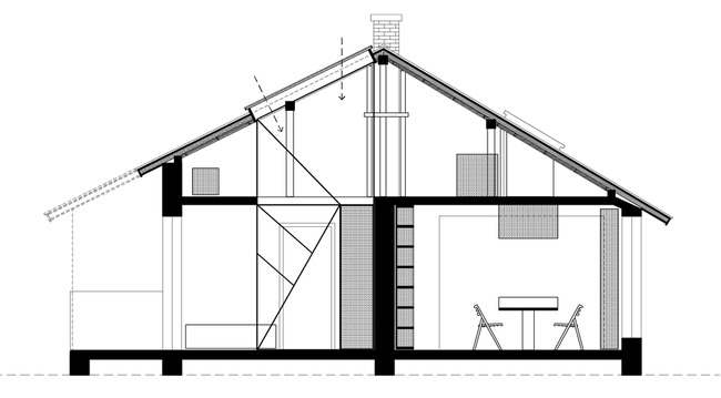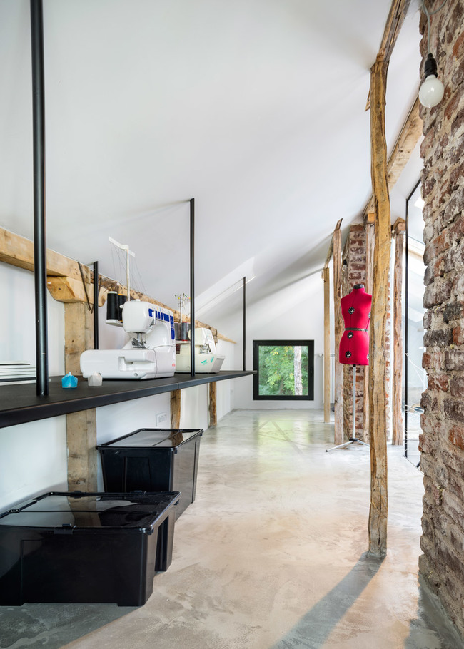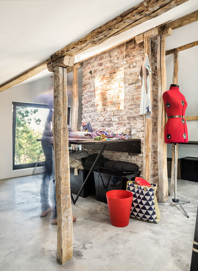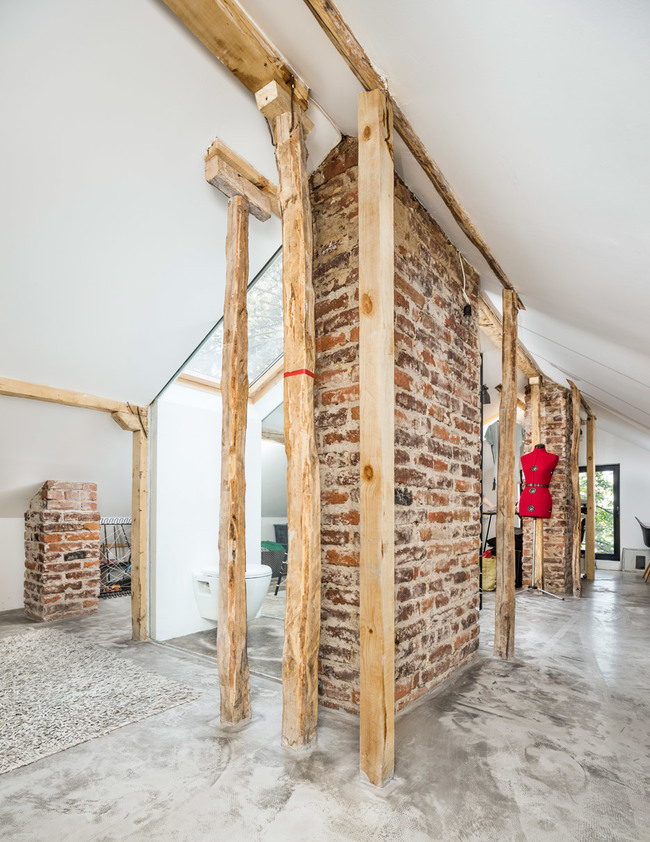Оригиналната дървена конструкция и тухлените комини на сградата са целенасочено запазени. Ъгловите покривни прозорци осигуряват допълнителна светлина и спомагат за естественото разделение на пространството. Всеки детайл и форма имат своето предназначение.