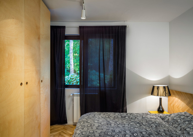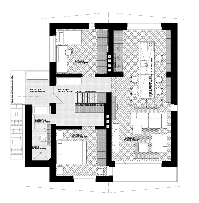 Трите основни стаи представляват визията на партерната площ. Основната спалня е от едната страна, детската стая е на противоположната, а всекидневна с отворен план и кухненски бокс се разпростира отвъд пространството.