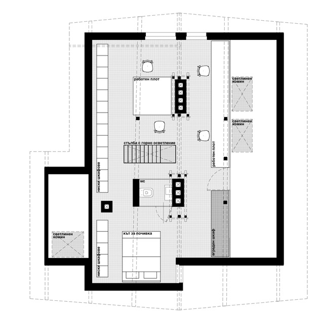 На второ ниво е разположено семпло ателие. Таванското му разположение изисква то да е отворено. Една част от него може да бъде преразпределена даже като спалня за гости при необходимост.