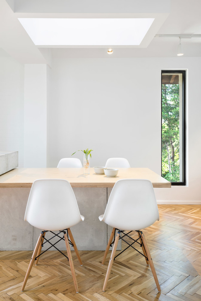 Черната дограма на фона на белите стени и столове в кухнята изглеждат особено изискано. Плотът прелива в маса за хранене, решена в светло естествено дърво. Разчупени тавани и красиви модерни столове придават тежест на помещението.