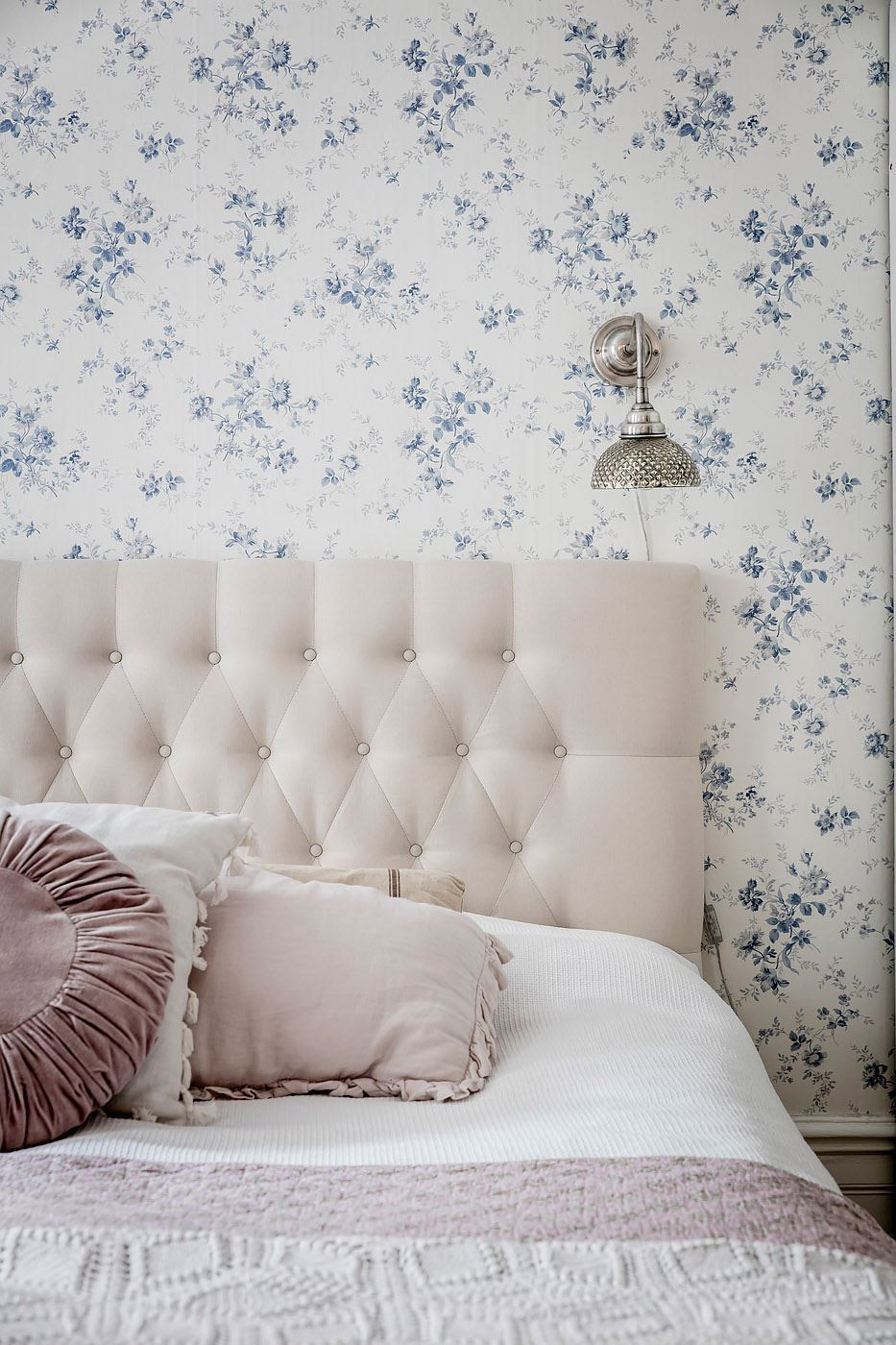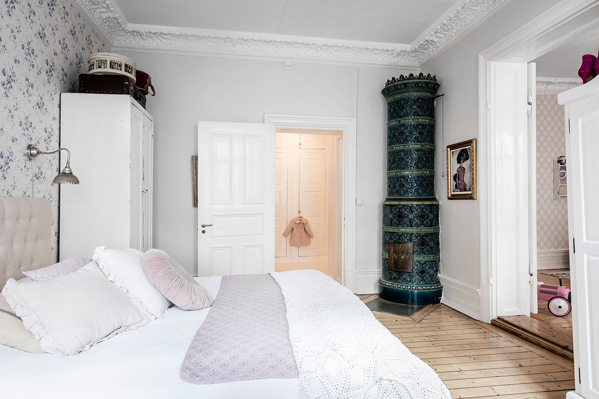 Преминавайки през двукрилата дървена врата се озоваваме в родителската спалня, която отново е обляна в слънчева светлина. Стените са боядисани в бледосиньо, за да подхождат на нежния тапет зад леглото, който е наситен с фини нежни цветчета. Кристалният полилей в центъра на тавана кореспондира с този в хола, а контрастът в стаята е осигурен от старинно кресло в тъмнокафяви краски и висока камина в синьо-зелено, типична за северните страни.
