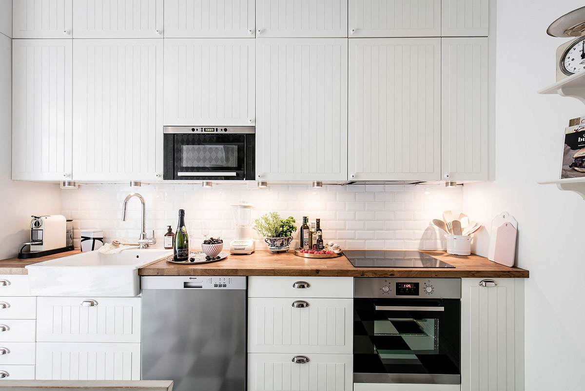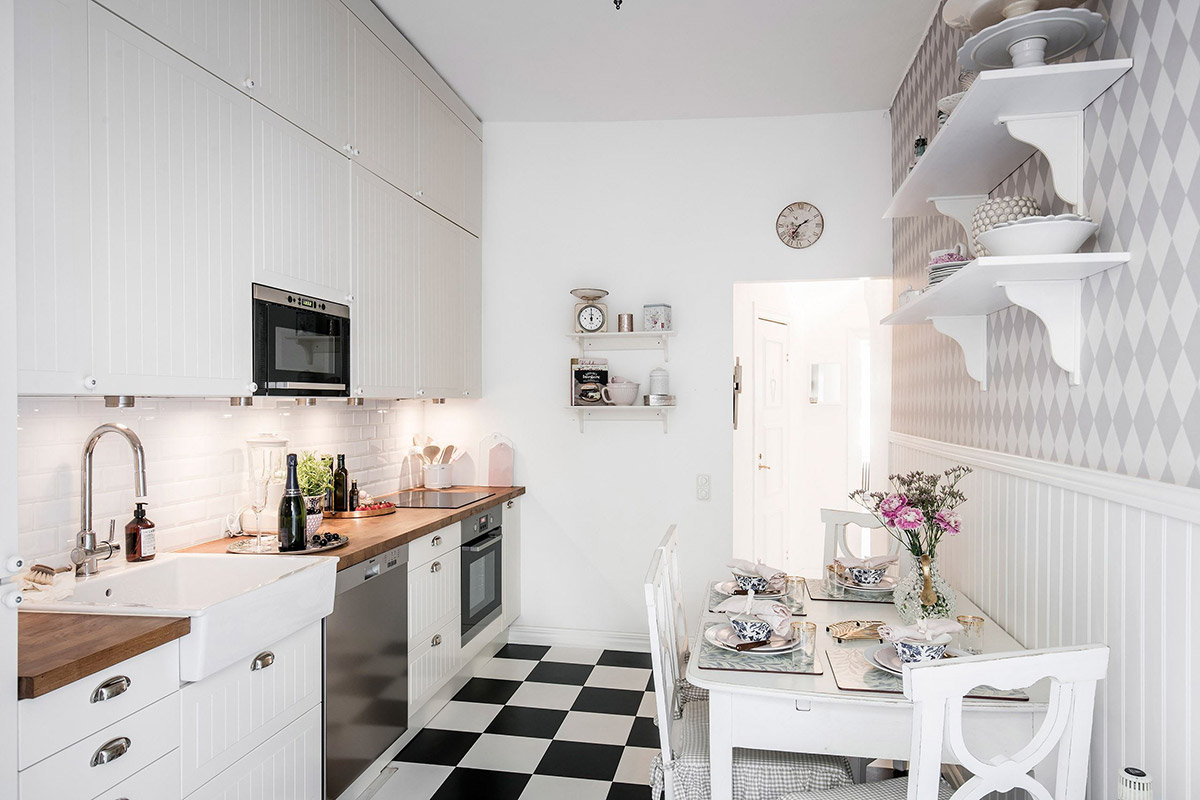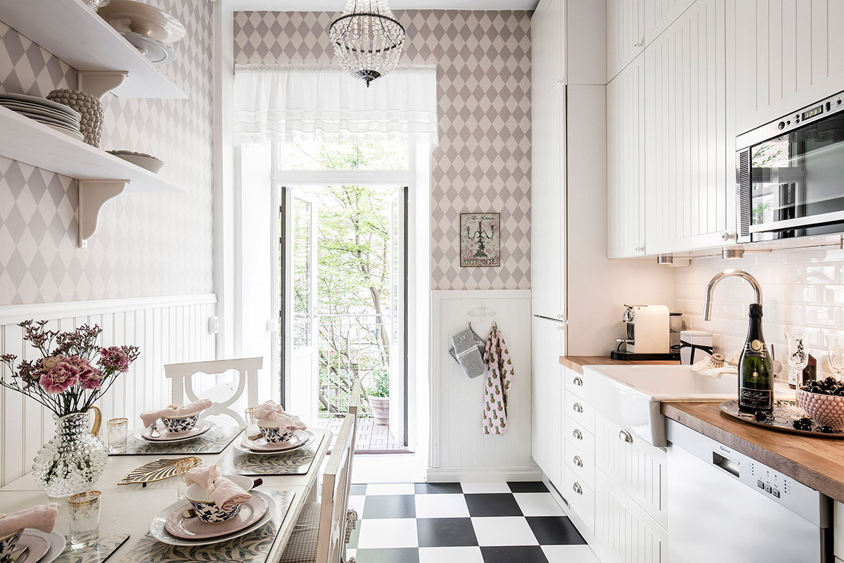Кухнята в апартамента е малка, но функционална и дори предлага излаз на балкон с гледка към вътрешния двор на сградата. Цветовата схема отново е в светли тонове, представена от двуцветни тапети на ромбове и кухненски шкафове в бяло. Впечатление прави черно-белият шахматен под, който сякаш не подхожда на цялостната романтична атмосфера, но в комбинация с модерните кухненски уреди, всичко си изглежда на място.