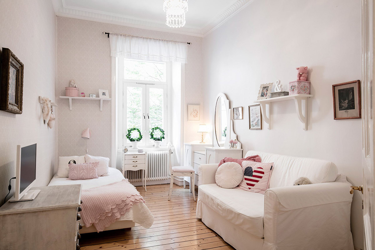 Към края на нашата обиколка ще обърнем внимание на още едно бижу в този светъл преходен апартамент, а именно детската стая. Освен с типичния за жилището кокетен интериор, тя грабва вниманието и с нестандартно разположение на две нива. На долното откриваме легло, двуместен диван и тоалетка с овално огледало, които очевидно са предназначени за подрастващо момиченце.