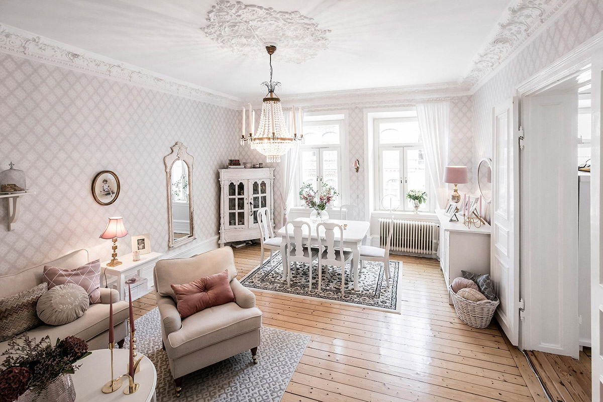 Жилищата със светъл интериор, огряни от изобилие от слънчеви лъчи, винаги са завладявали сърцата ни. Комбинирайте това с кокетен интериор наситен с класически мебели, винтидж детайли и нежни орнаменти, и ще разберете защо нямаше как да не ви покажем този прелестен светъл преходен апартамент.