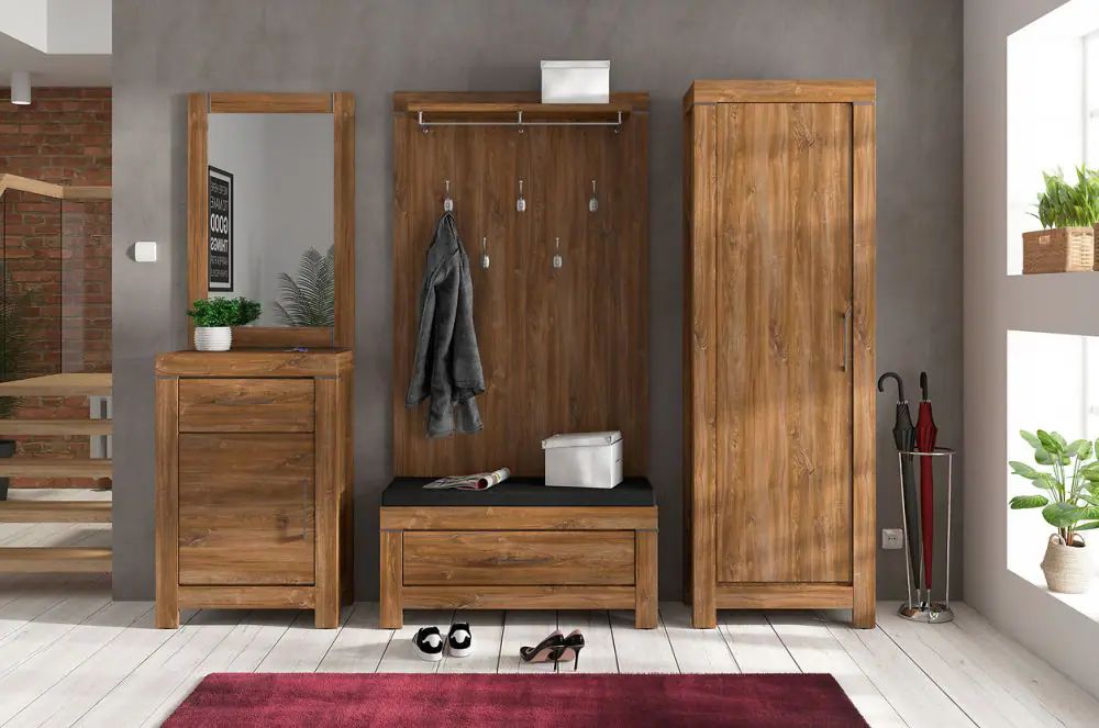 С модулна система Гент можете лесно и функционално да обзаведете антрето у дома! Изберете висок шкаф, закачалка с рафт, шкаф за обувки с пейка и стенно огледало с компактен шкаф в атрактивен дървесен цвят.