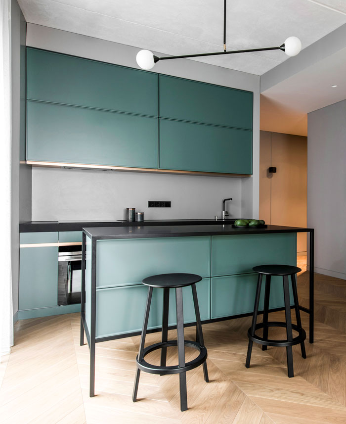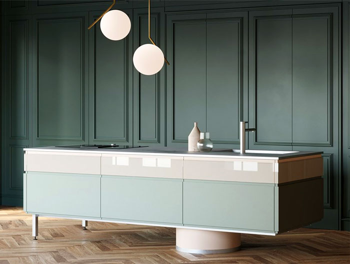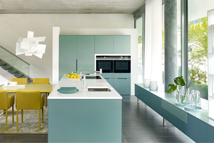 Актуалните цветове са пастелните тонове, вариации на зеленото – от морско синьо-зелено до графитени или сивеещи тоналности с деликатен зелен оттенък – всички те са високо ценени в изграждането на кухненския проект. За баланс могат да бъдат добавен метални акценти, опушено стъкло и нюанси на цвят сметана.