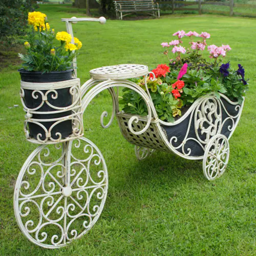 Ако имате голяма площ, засята с райграс, колелото от ковано желязо с цветни кашпи е отличен избор за акцент върху свежата зеленина.