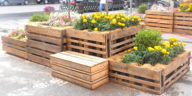 Непотребните ламаринени кутии от бои, маслини или лакове могат да съживят визията на стария стълб в двора. Оцветете ги пъстри – на точки, в райе и засейте в тях любими нежни цветя. Подредете ги несиметрично около стълба на определено разстояние една от друга.
