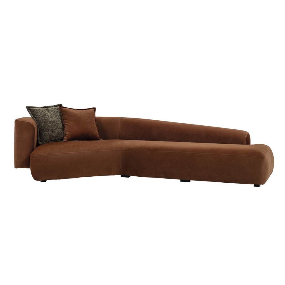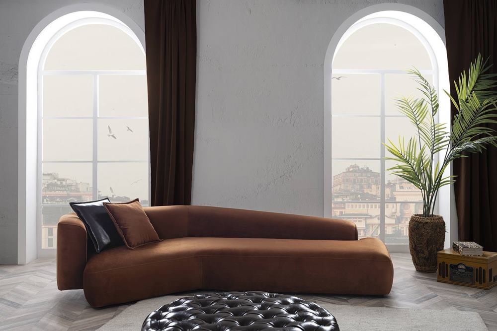 Красив ъглов диван с текстилна дамаска в кафяв цвят и нестандартна форма, подходящ за лоби на хотел или приемна в офис.