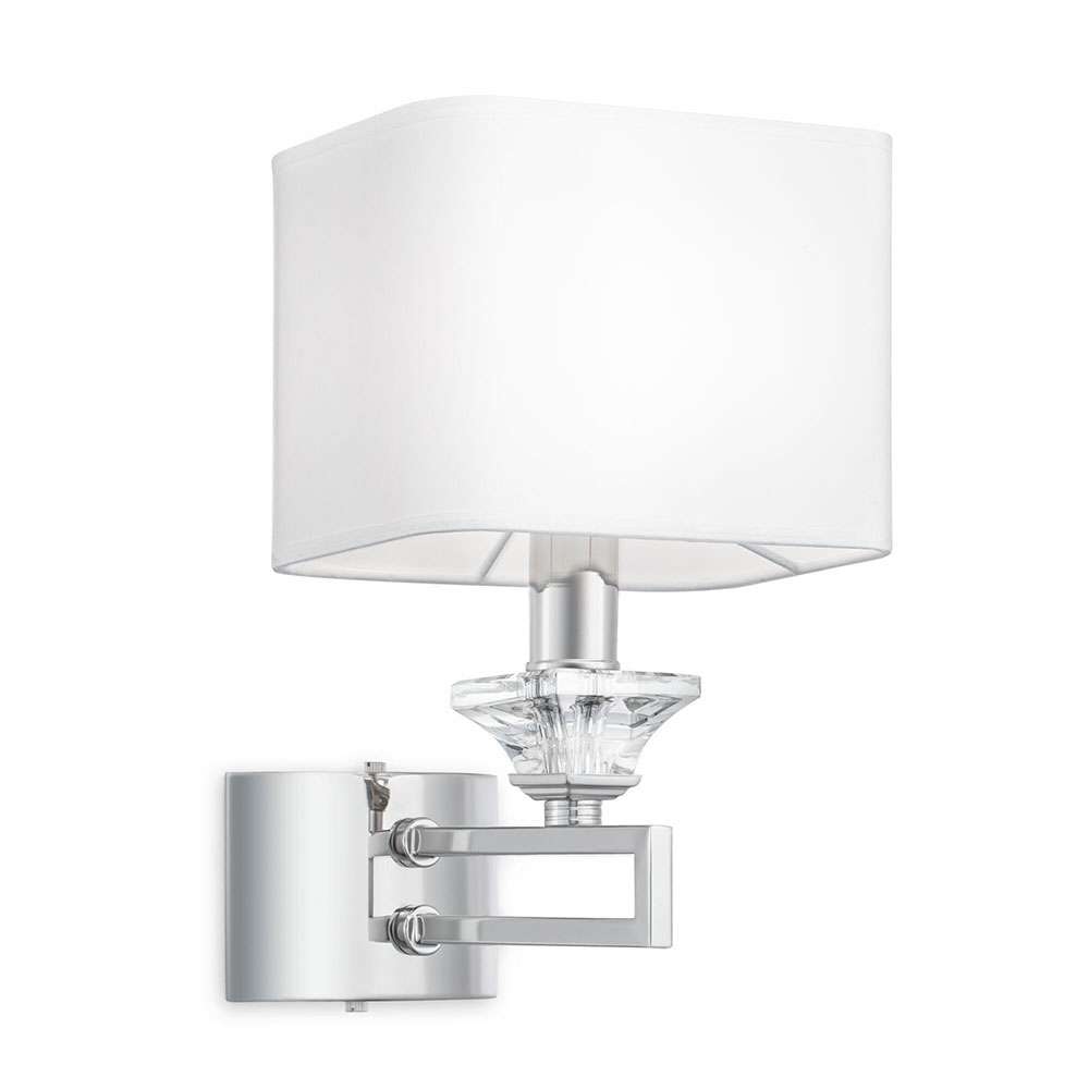 Аплик, изработен от метал в цвят хром с детайл от стъкло и бяла правоъгълна шапка от текстил върху PVC рамка Maytoni, серия Ontario.