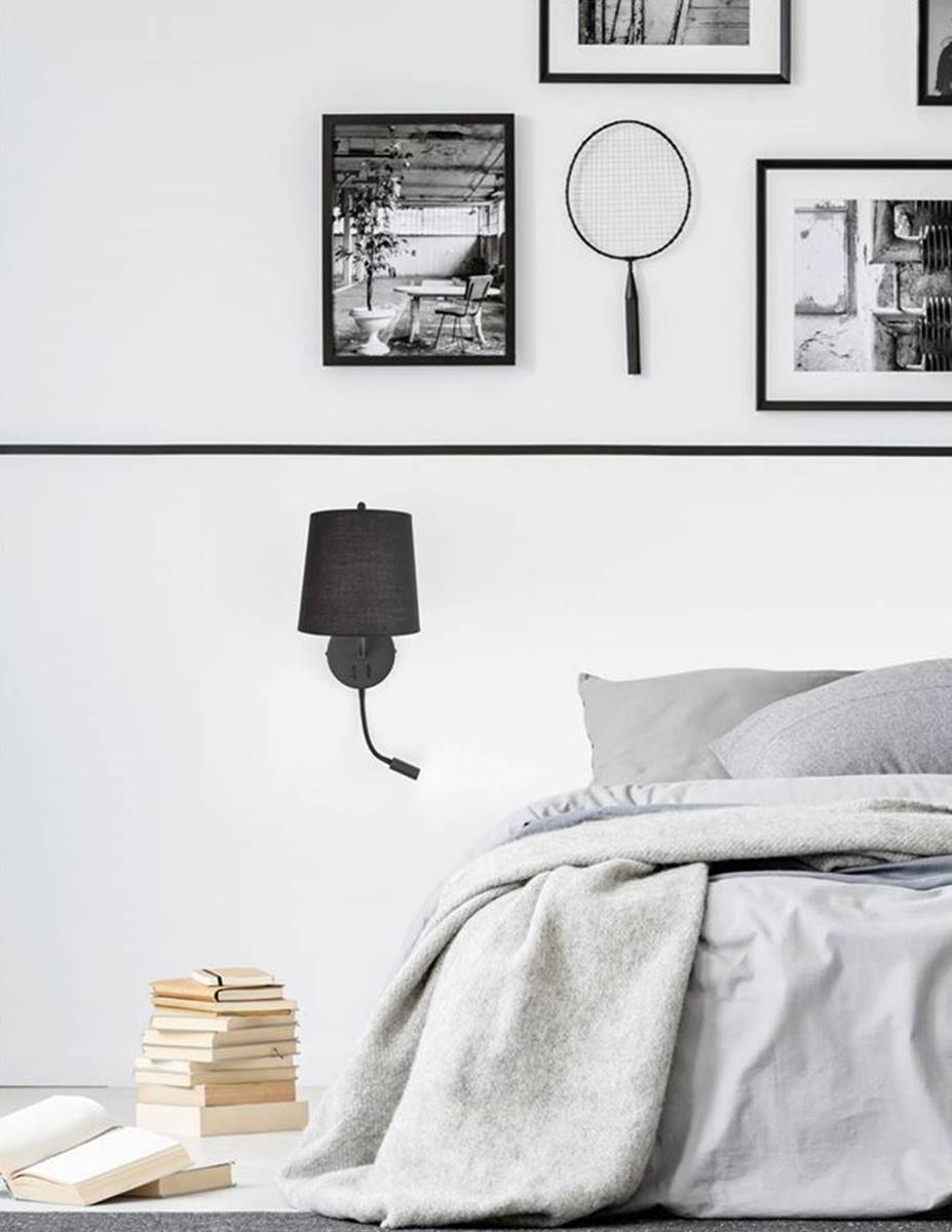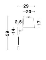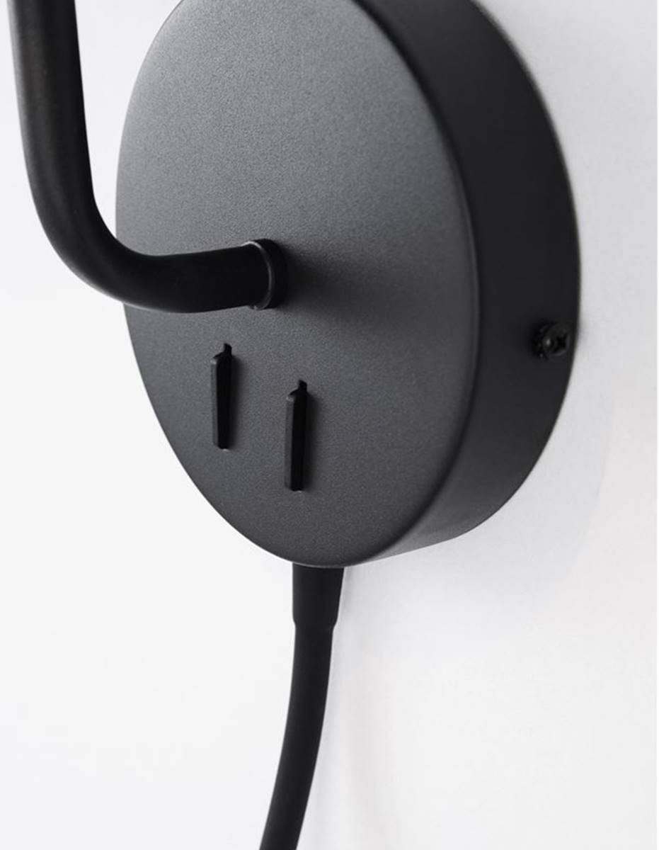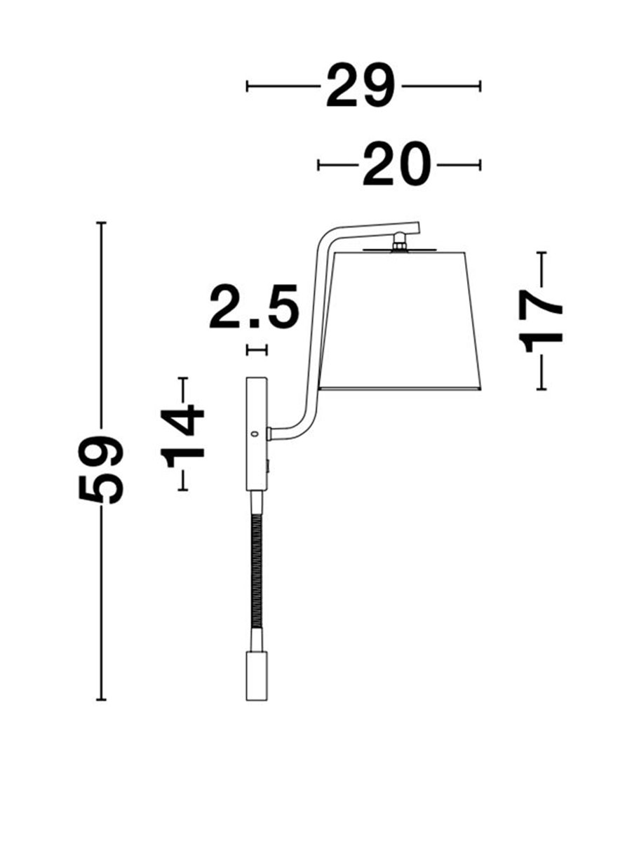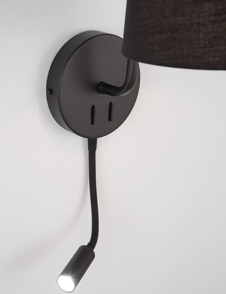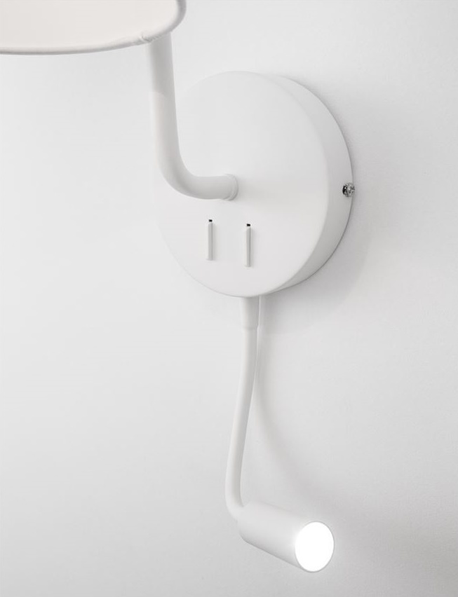 Аплик с абажур и второ тяло с насочване на светлината, предлаган в два цвята – бял и черен.