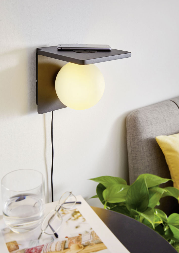 Функционален LED аплик с черен корпус и бяло сферично тяло от опал стъкло с поставка и функция за QI безжично зареждане на телефони Eglo, серия Ciglie.