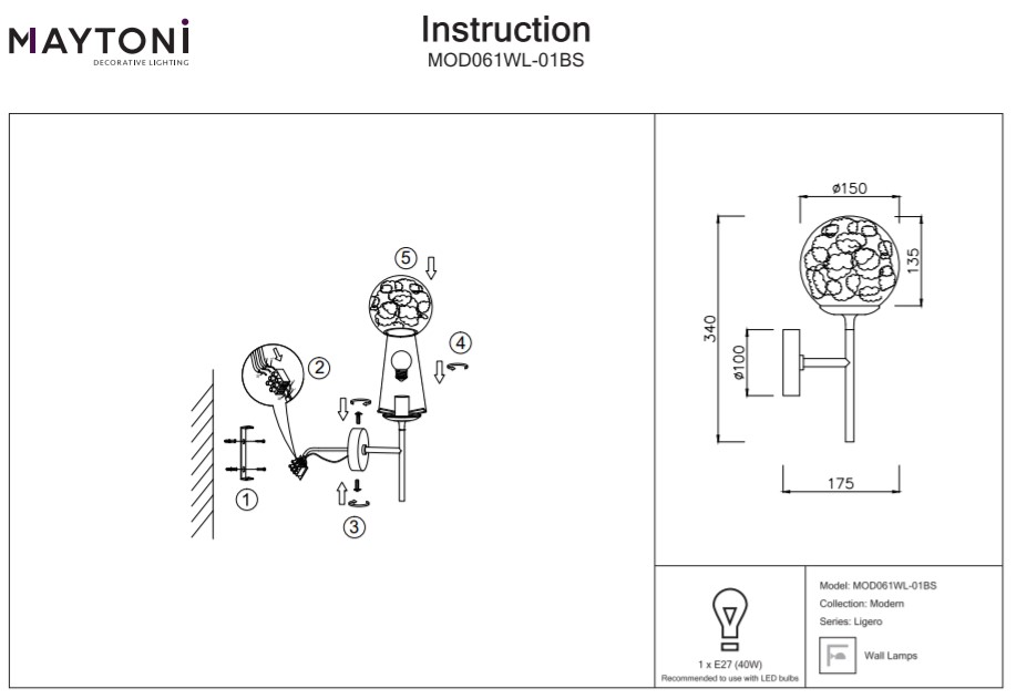 - Размери: диаметър абажур – 15 см, височина – 34 см, разстояние от стената – 17,5 см, диаметър основа – 10 см