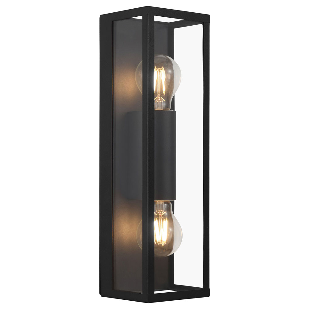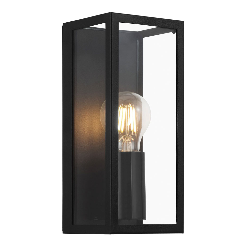 Aплик с влагозащита, подходящ за баня, изработен под формата на стъклена кутия с рамка от черен метал, Eglo, серия Amezola.