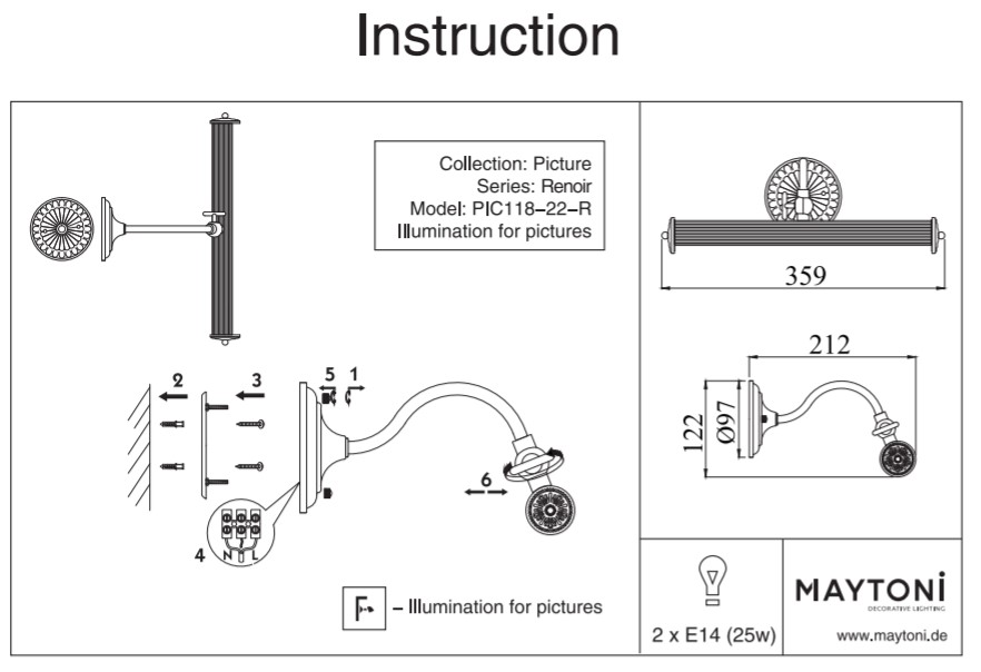 Аплик за картина с красива декорация, изработен от метал с механизъм за регулиране на ъгъла на осветяване Maytoni, серия Renoir.