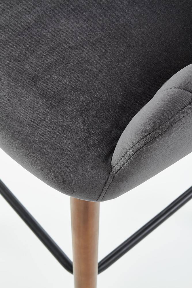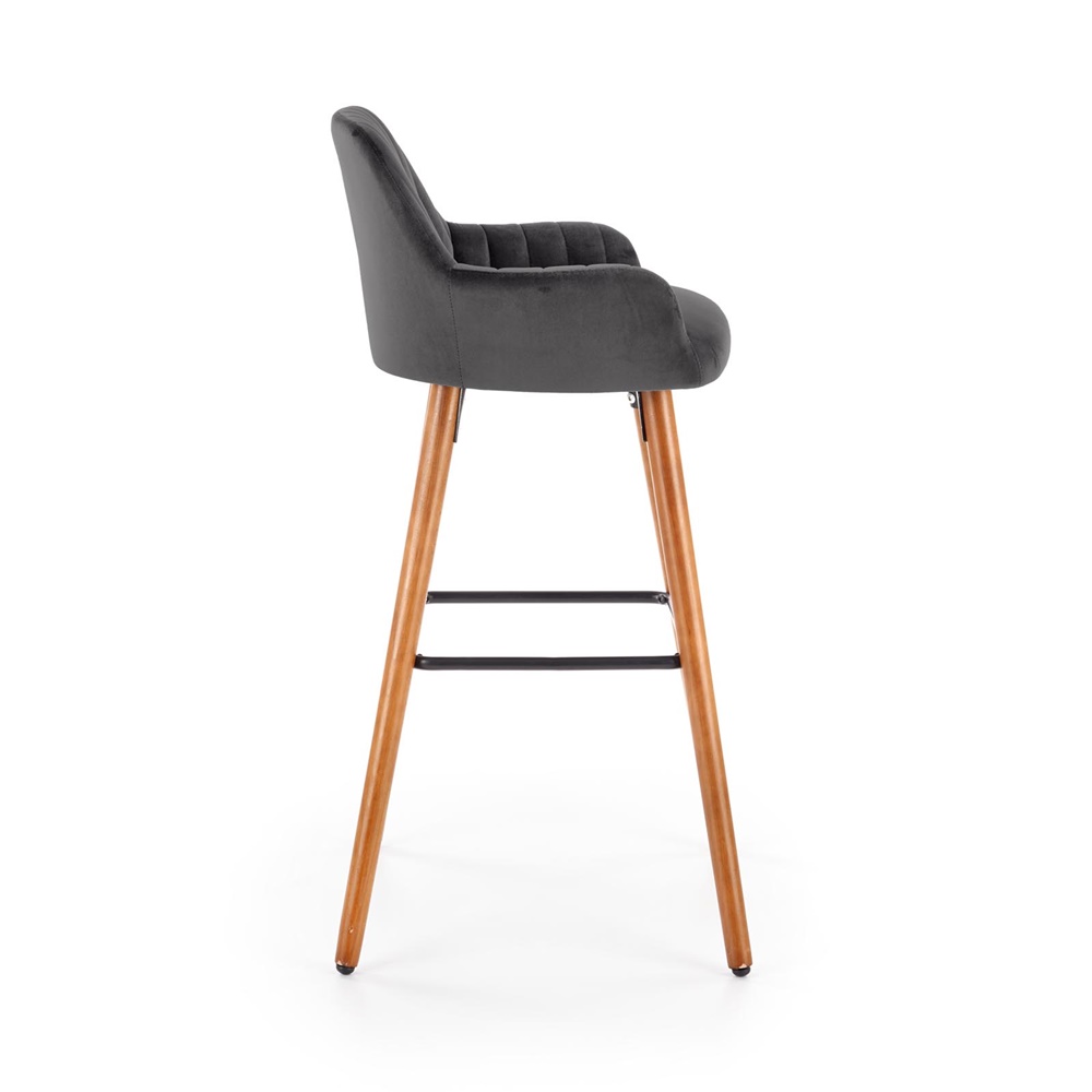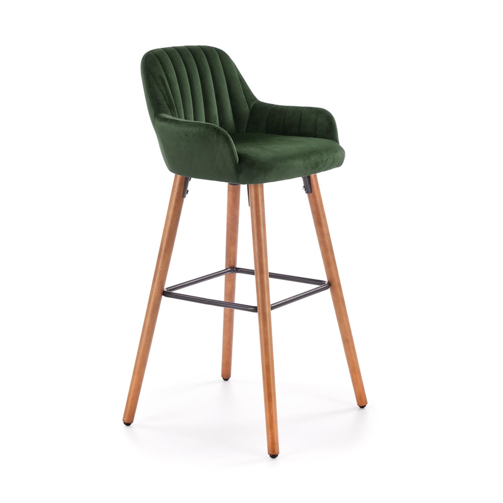 Красив бар стол от масивно дърво с текстилна дамаска, подлакътници и облегалка с удобно място за стъпване. Изработен в три цветови комбинации – тъмносиньо, тъмнозелено и тъмносиво с орех.