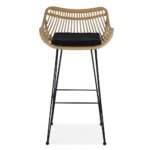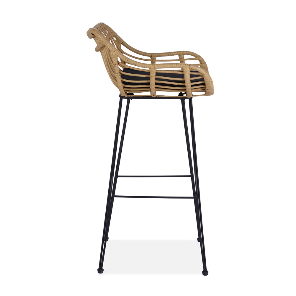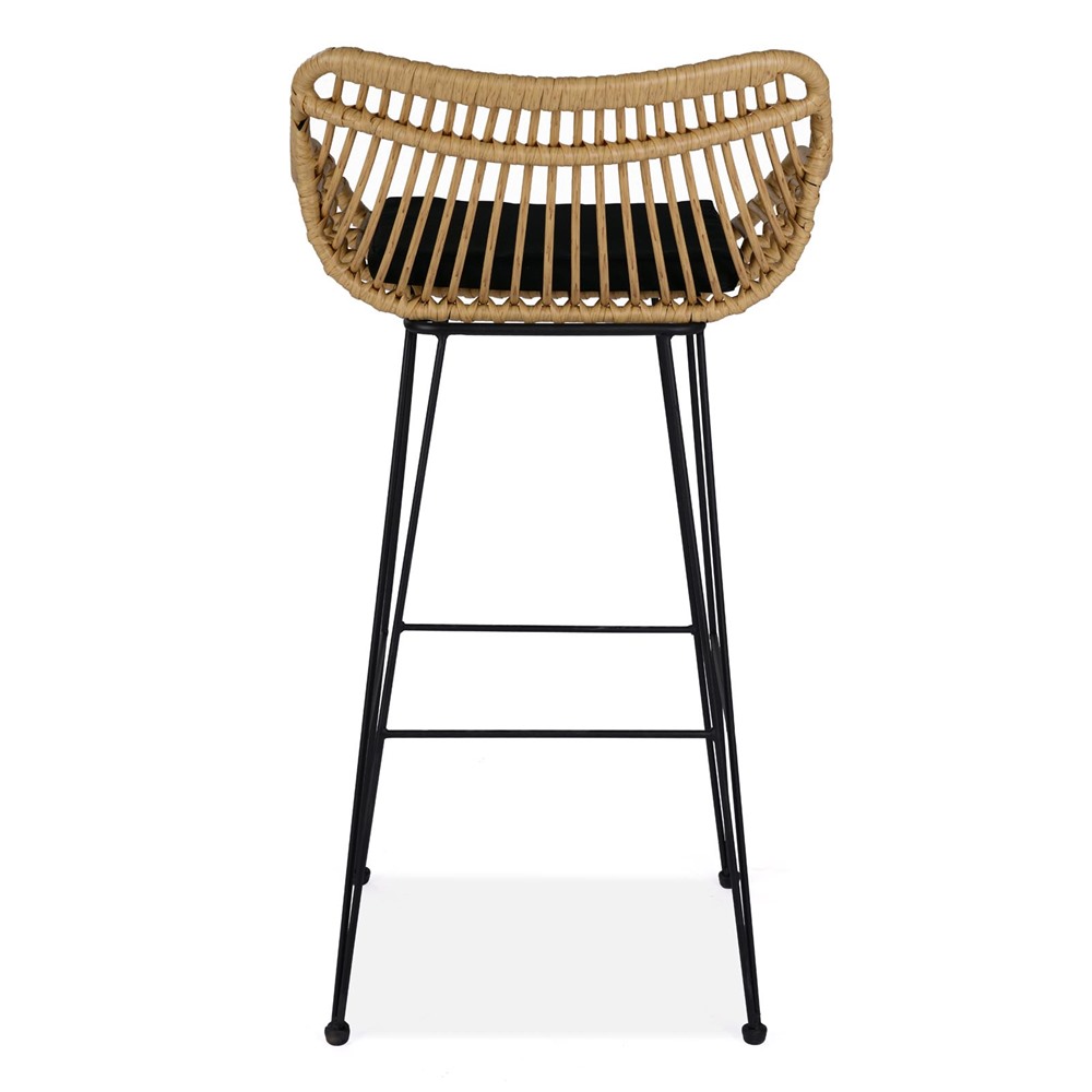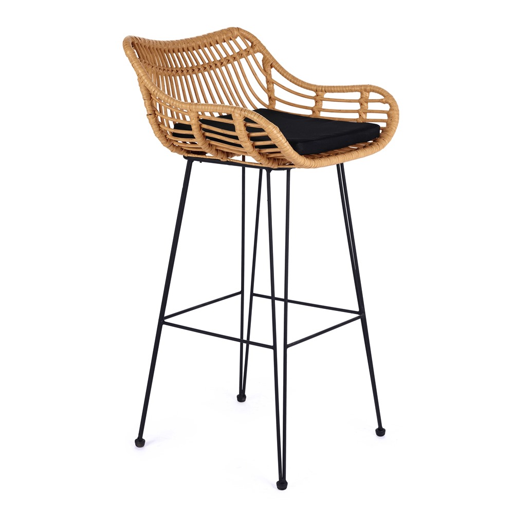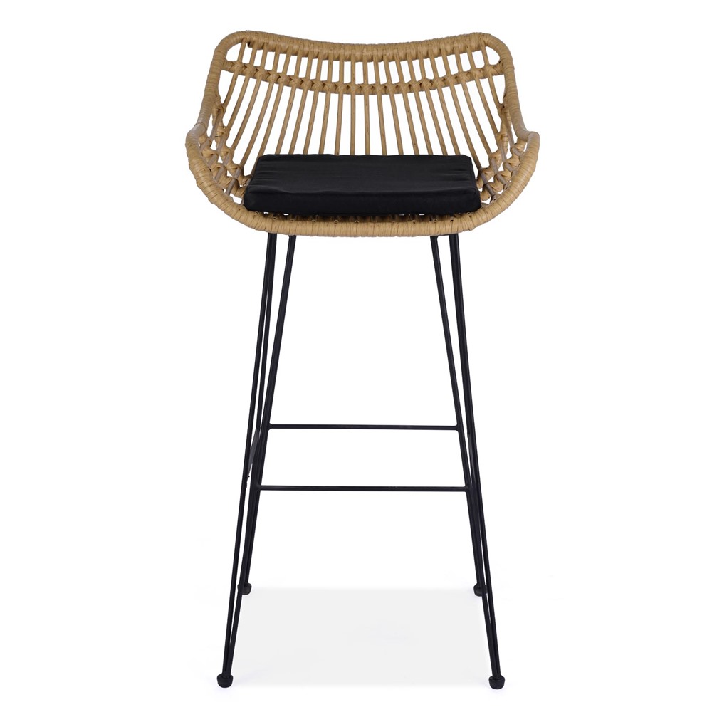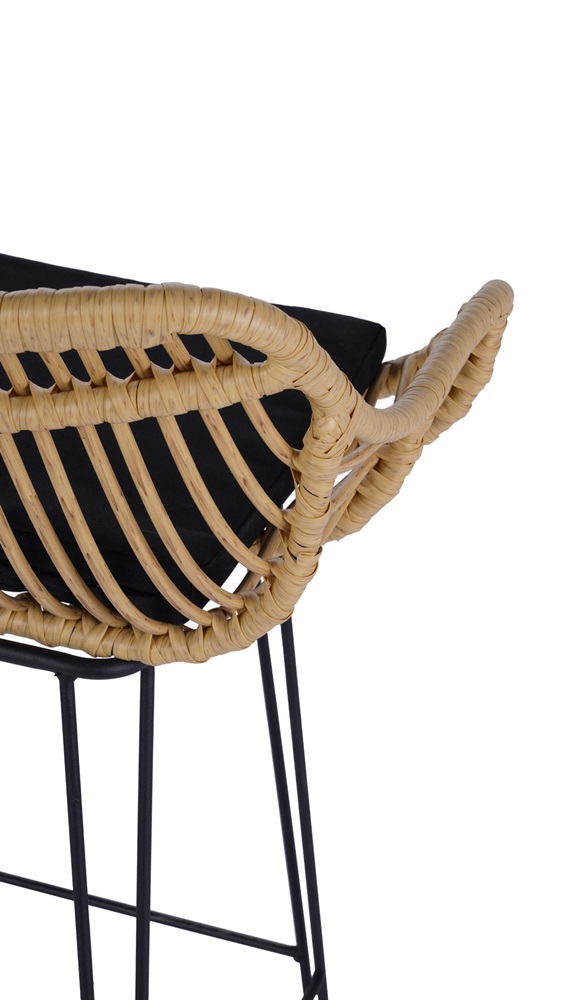 Бар стол от синтетичен ратан с черна възглавничка на седалката и тъмни метални крака.