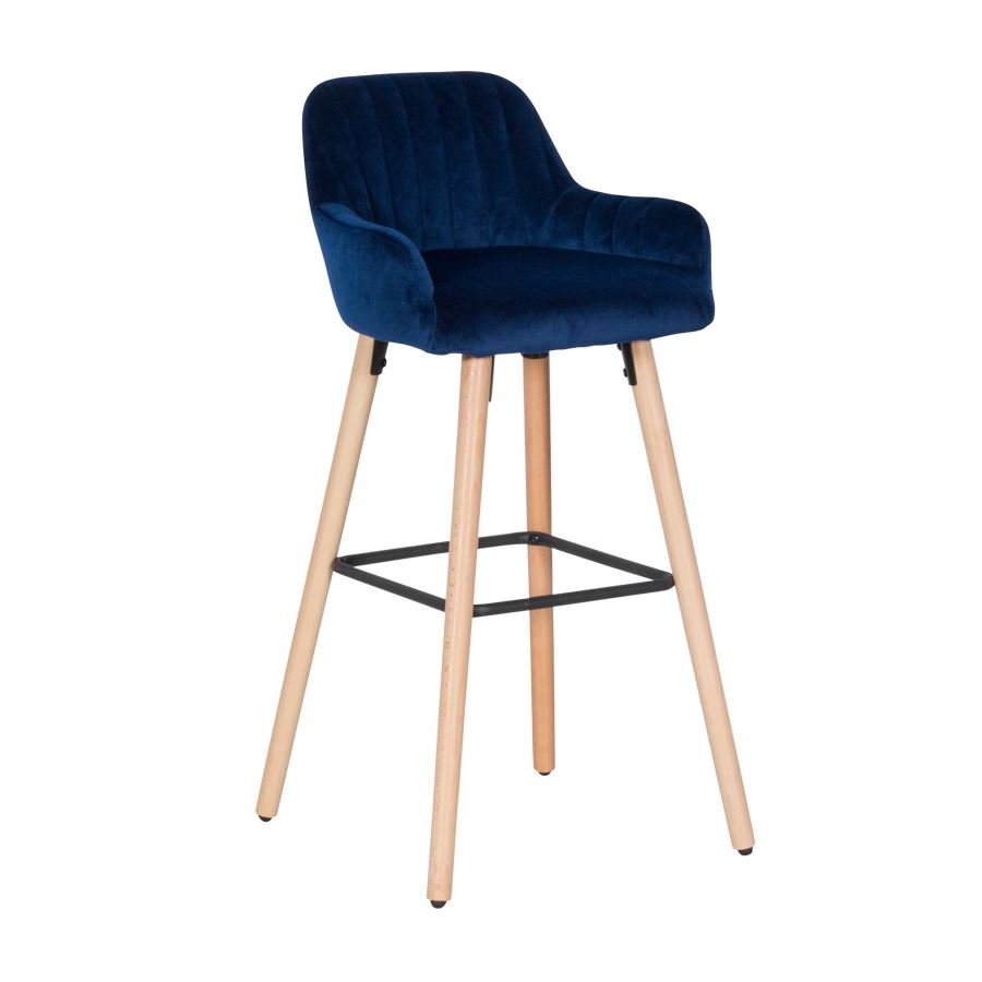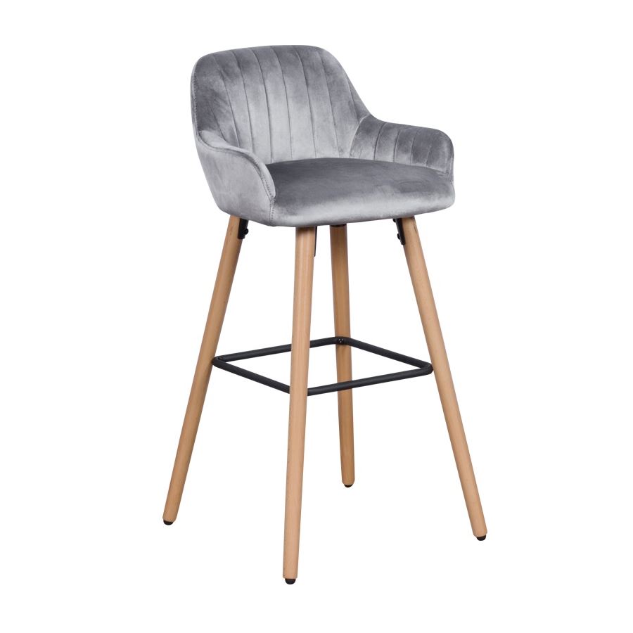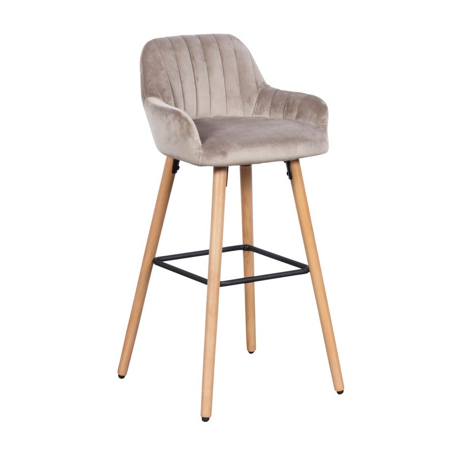 Стилният бар стол с подлакътници и удобно място за поставяне на краката е изработен с дървени крака от бук, и мека на допир текстилна дамаска.