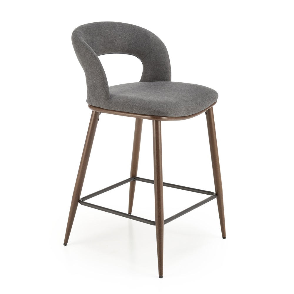 Стилен бар стол с текстилна дамаска в сиво или бежово и крака в орех.