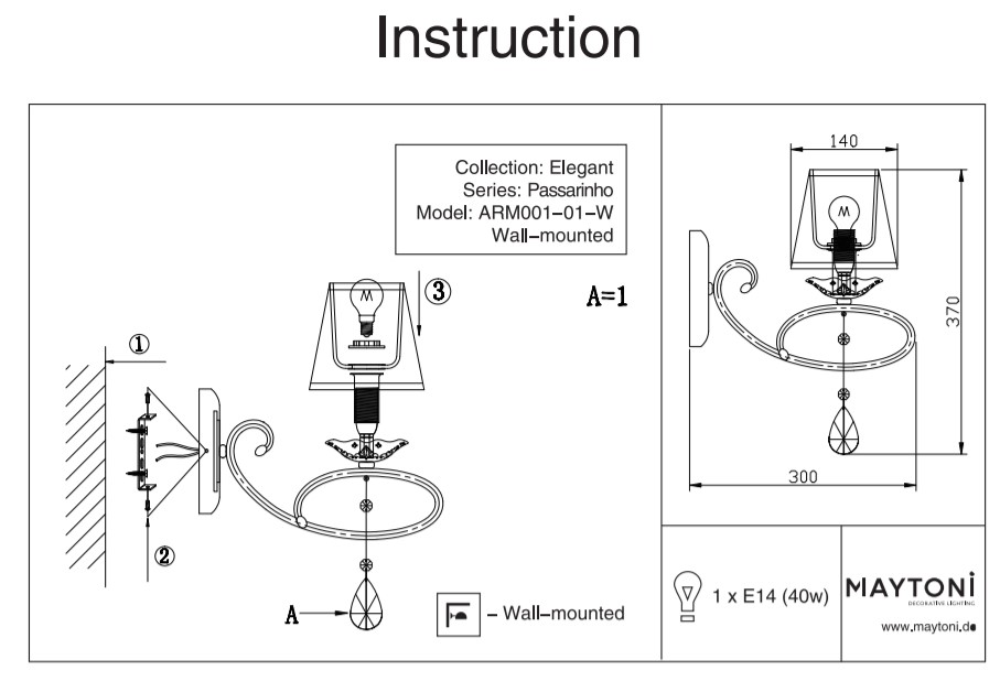 - Размери: диаметър шапка – 14 см, височина – 37 см, разстояние от стената – 30 см