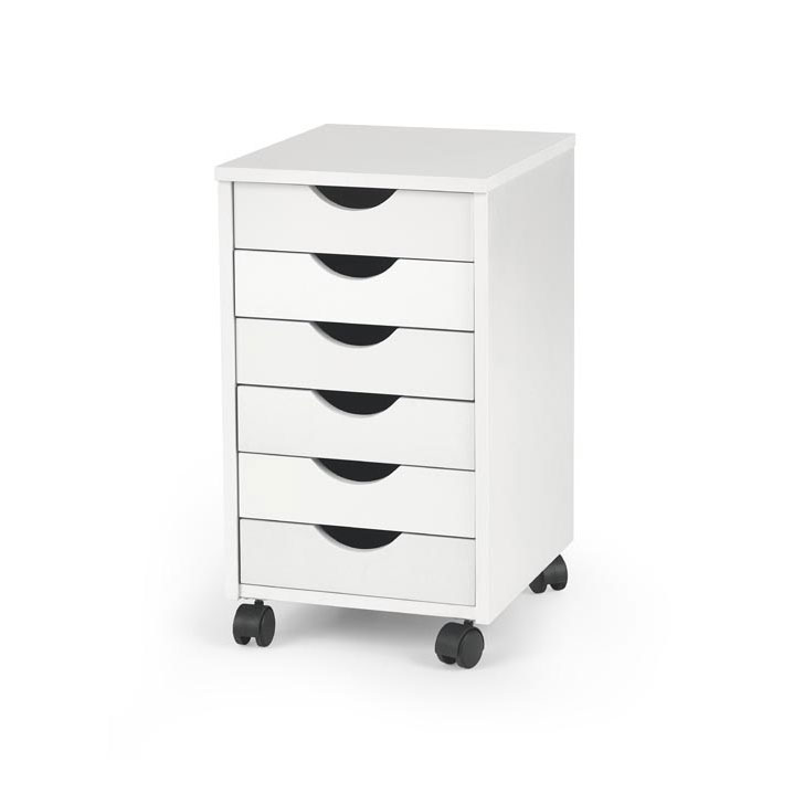 Практичен и компактен бял контейнер от дърво с 6 чекмеджета на колелца, подходящ за ползване у дома или офиса.
