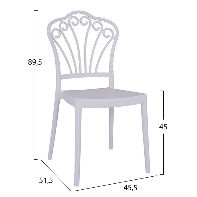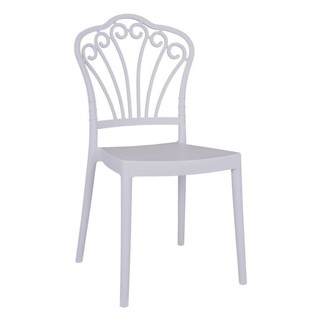 Бял трапезен стол с интересна облегалка, изработен от високоустойчив полипропилен.