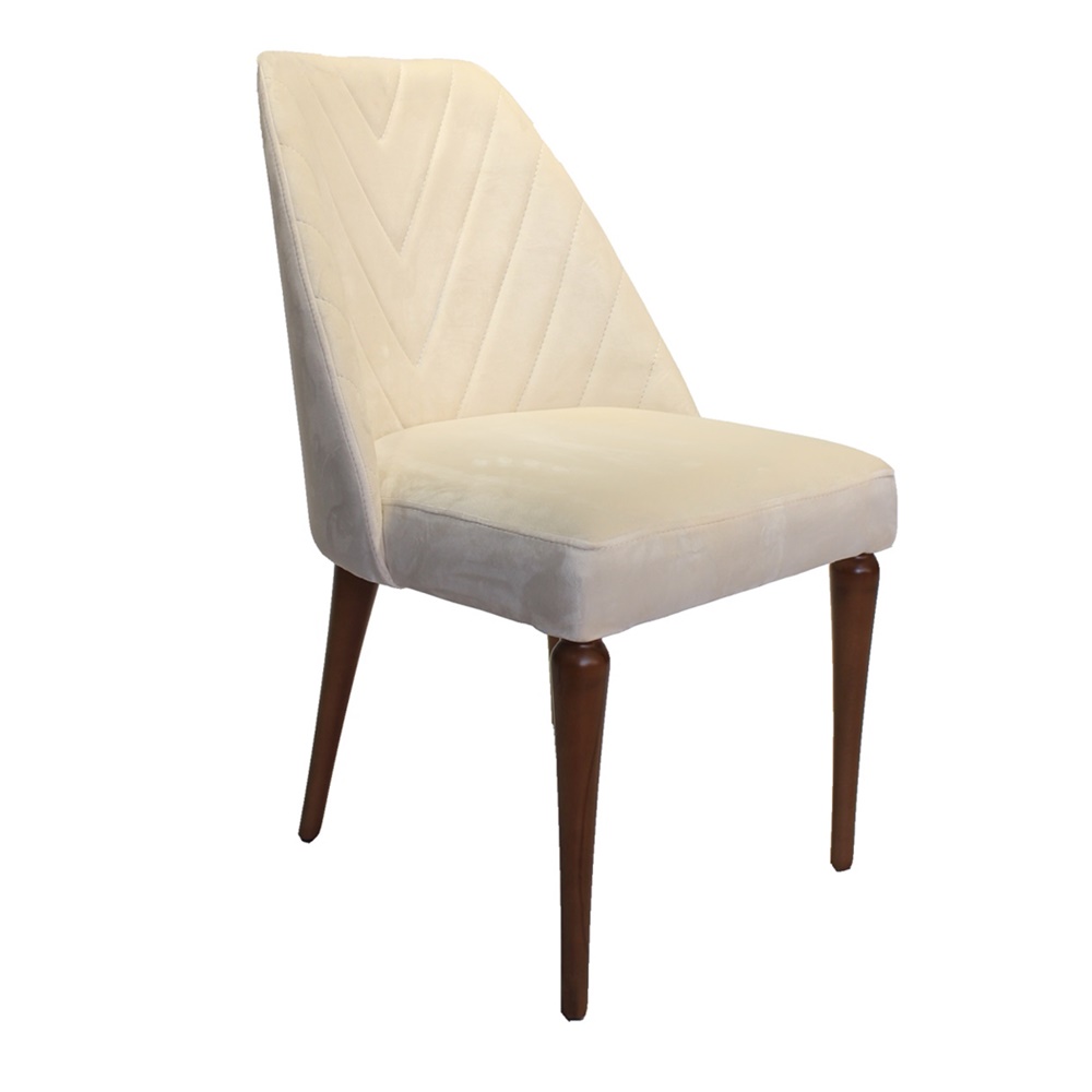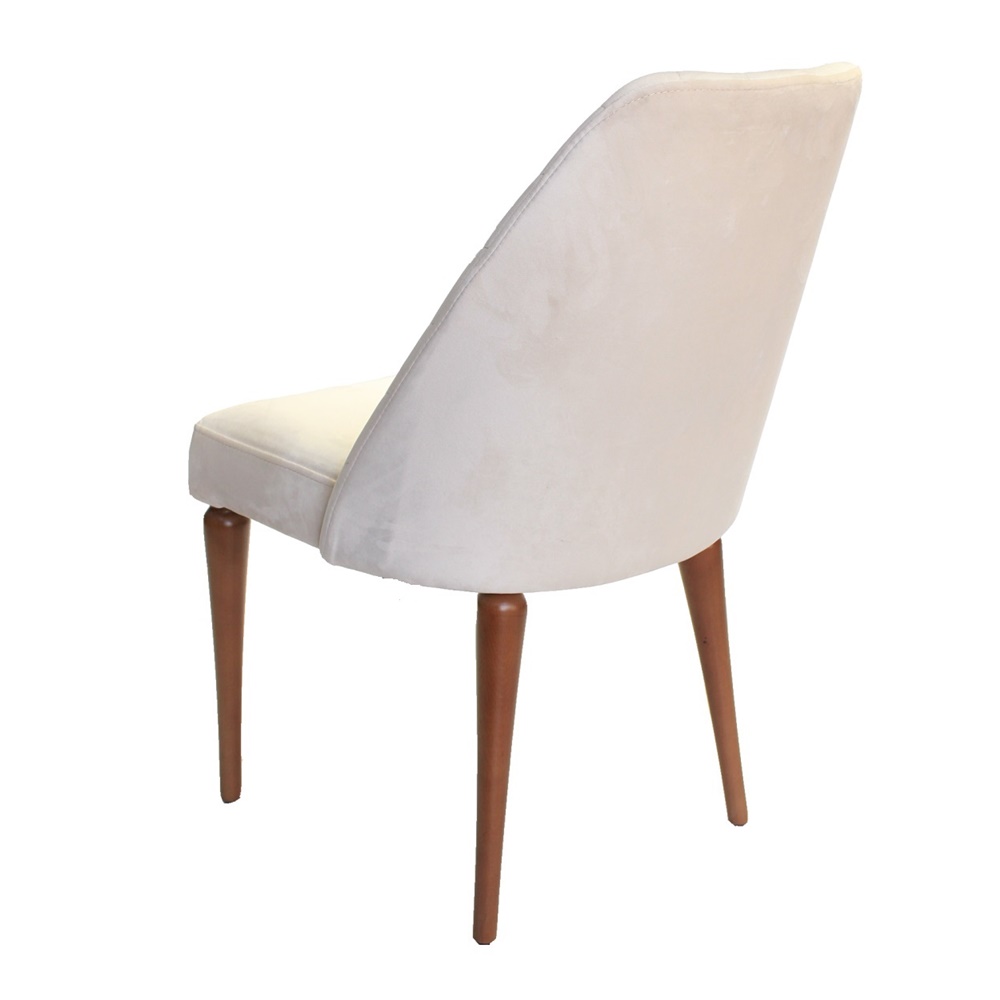 Бял трапезен стол, изработен с основа от масив, дървени крака в цвят тъмен орех и мека текстилна дамаска.