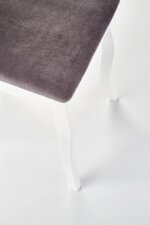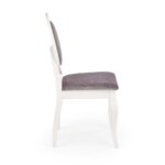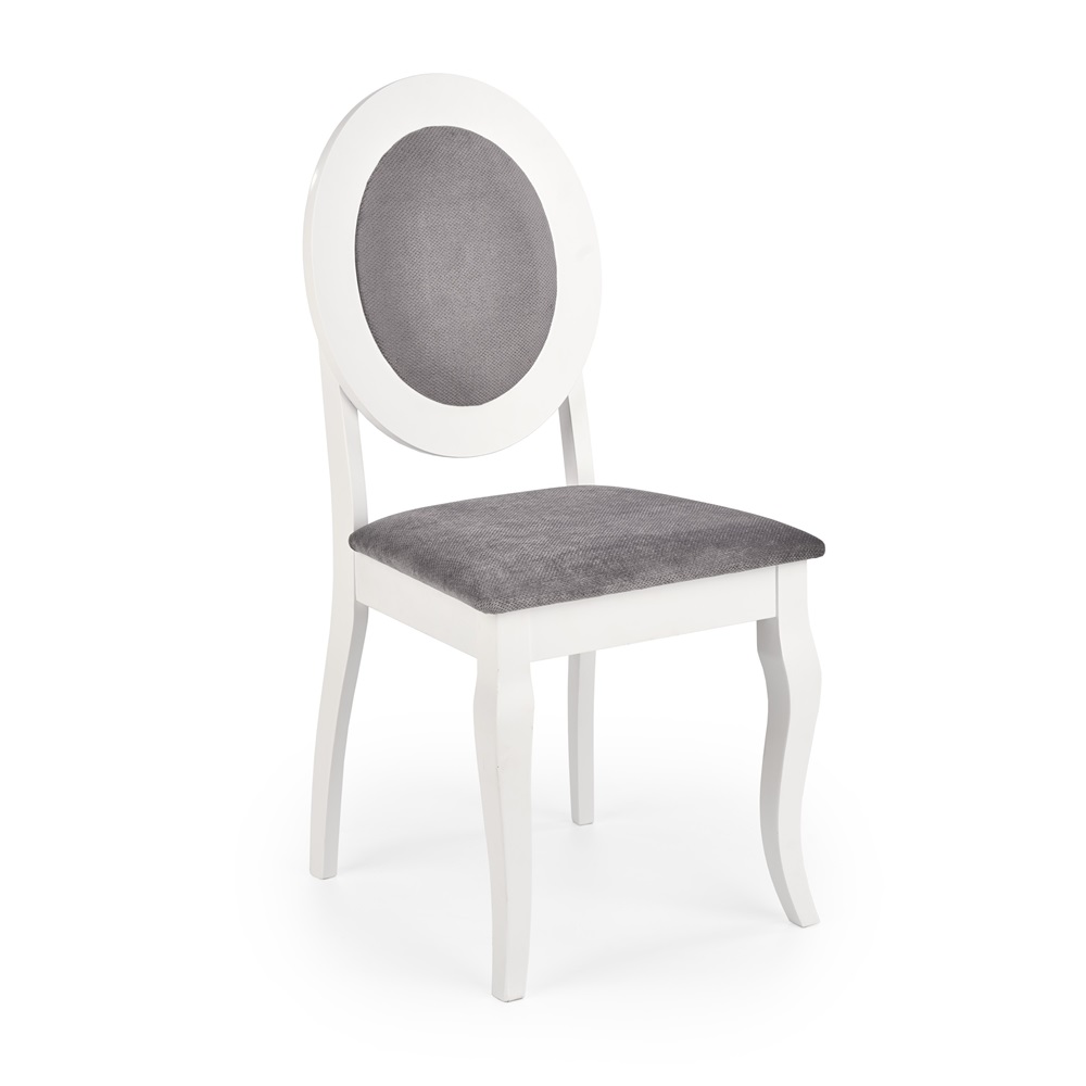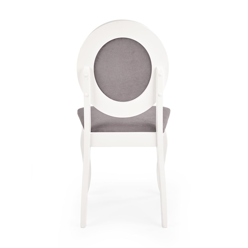 Бял трапезен стол със сива дамаска, изработен от каучукова дървесина и текстил.