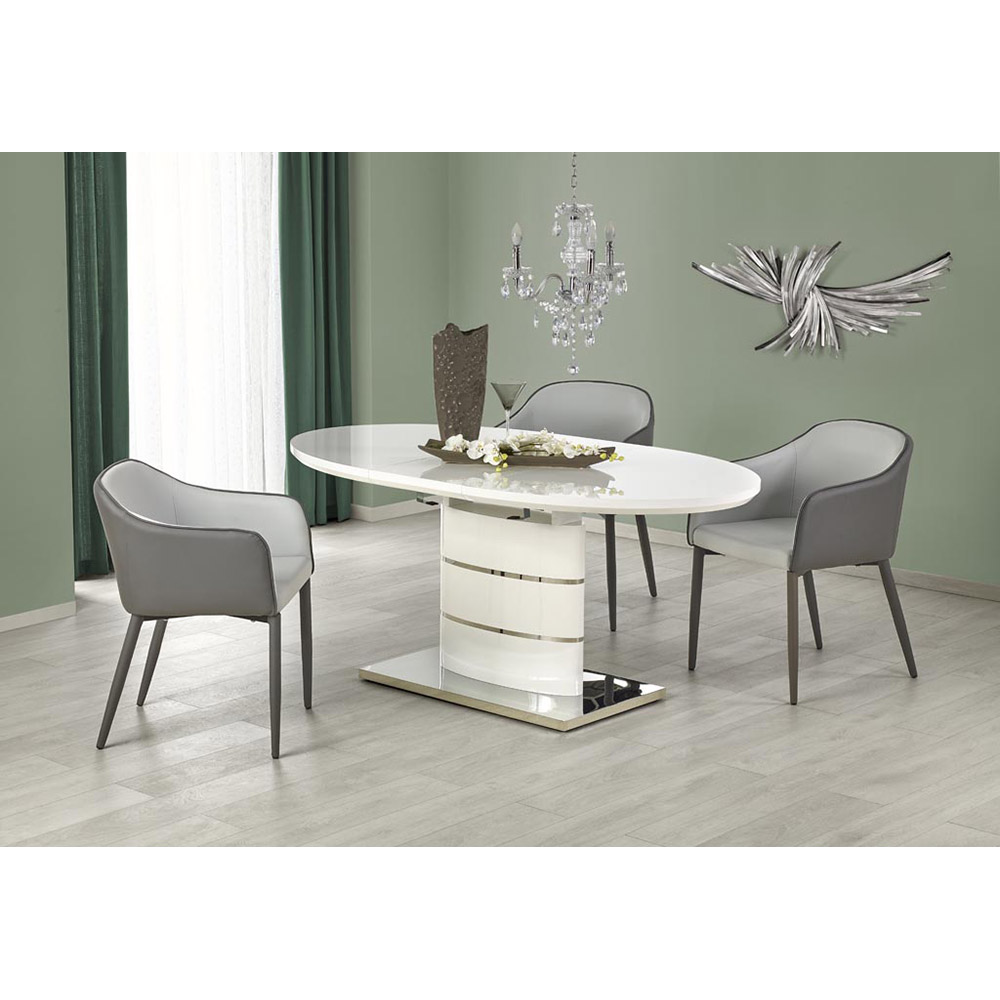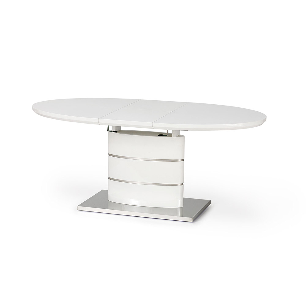 Бяла елипсовидна трапезна маса с разтегателен плот от лакиран МДФ и основа от неръждаема стомана.