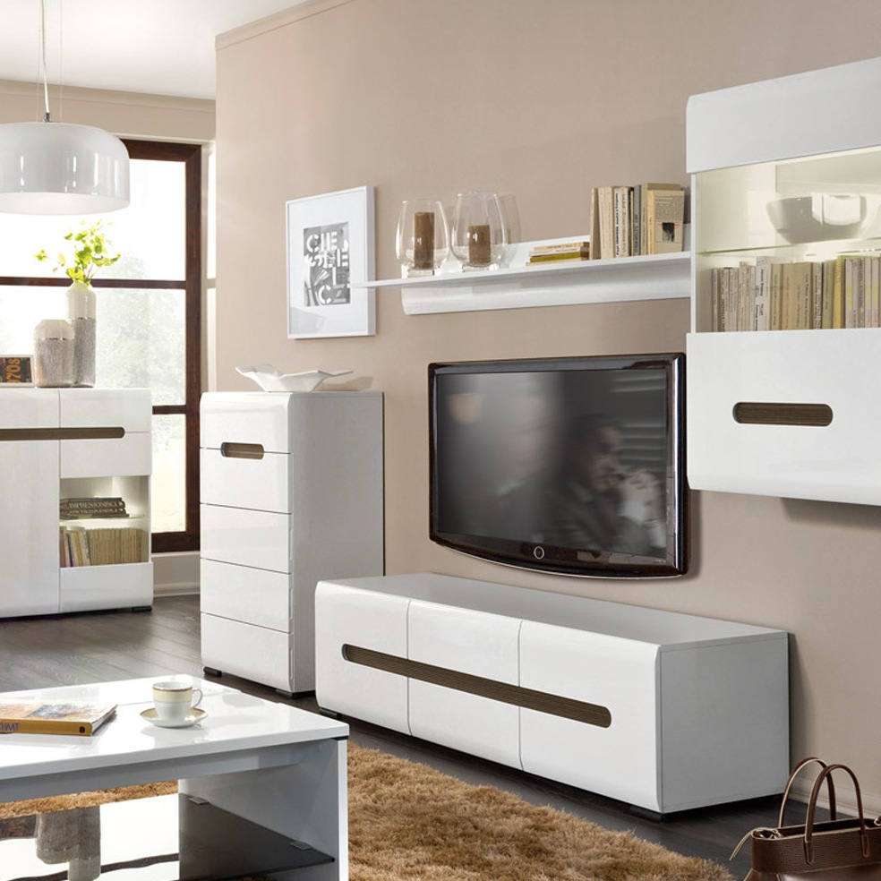 Състои се от скрин с пет чекмеджета, ТВ шкаф с две чекмеджета и вратички, стенен рафт и стенен шкаф със стъклена витрина и осветление.