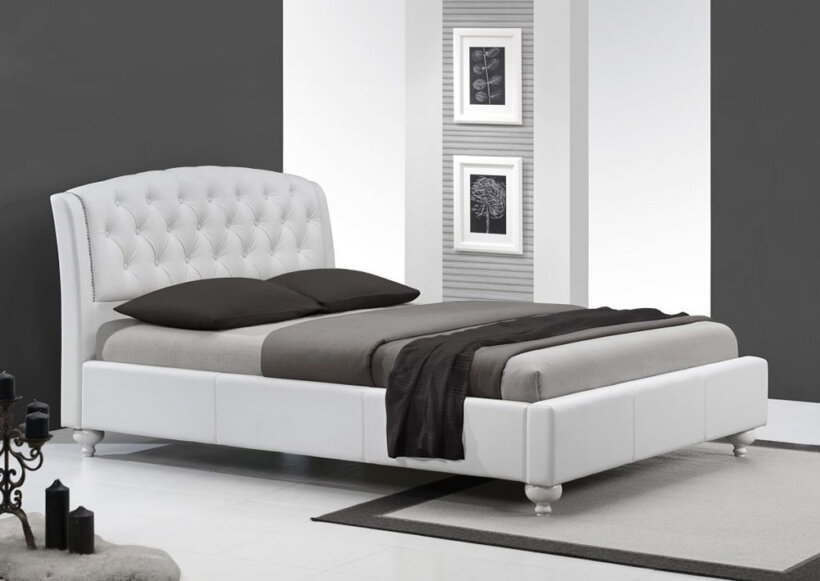 Бяло легло от еко кожа с елегантна табла и ниски крачета, подходящо за матрак 160 х 200 см.