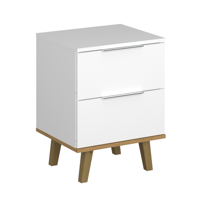 Бяло нощно шкафче с две чекмеджета с елегантни дръжки и дървени крачета в цвят каменен дъб, модулна система Нептун.