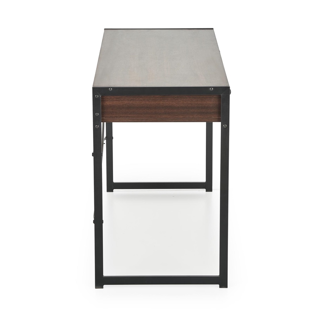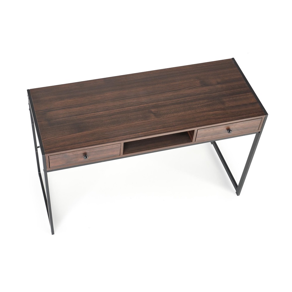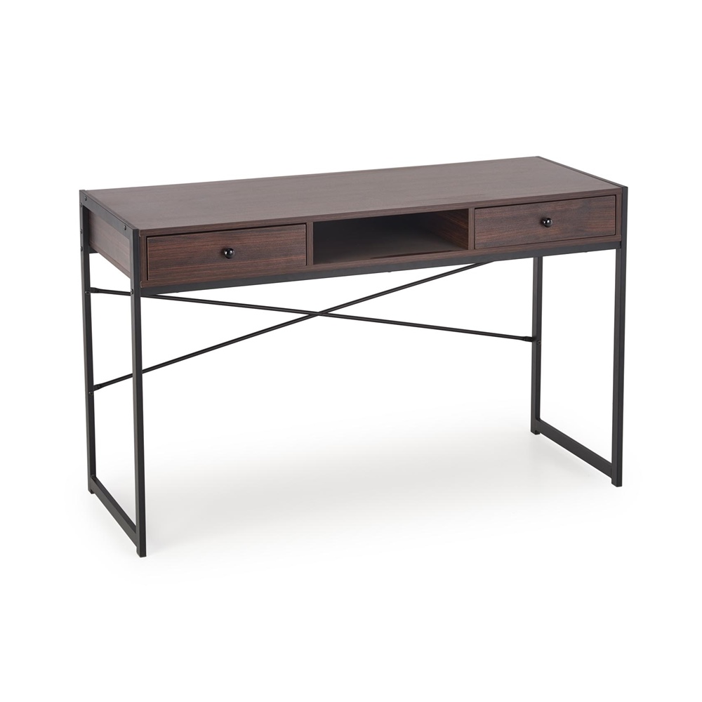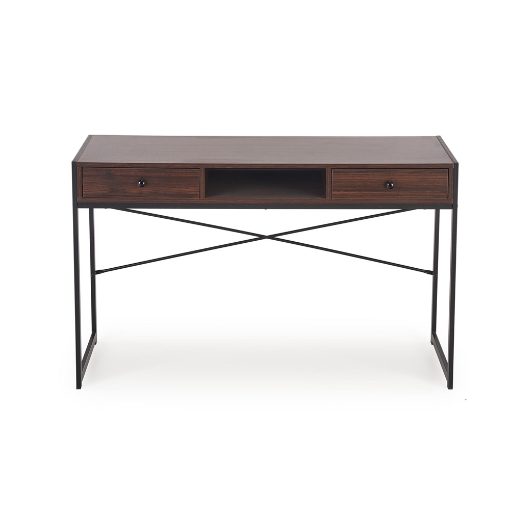 Бюро от ПДЧ с меламиново покритие в цвят орех с две чекмеджета и черна метална основа.