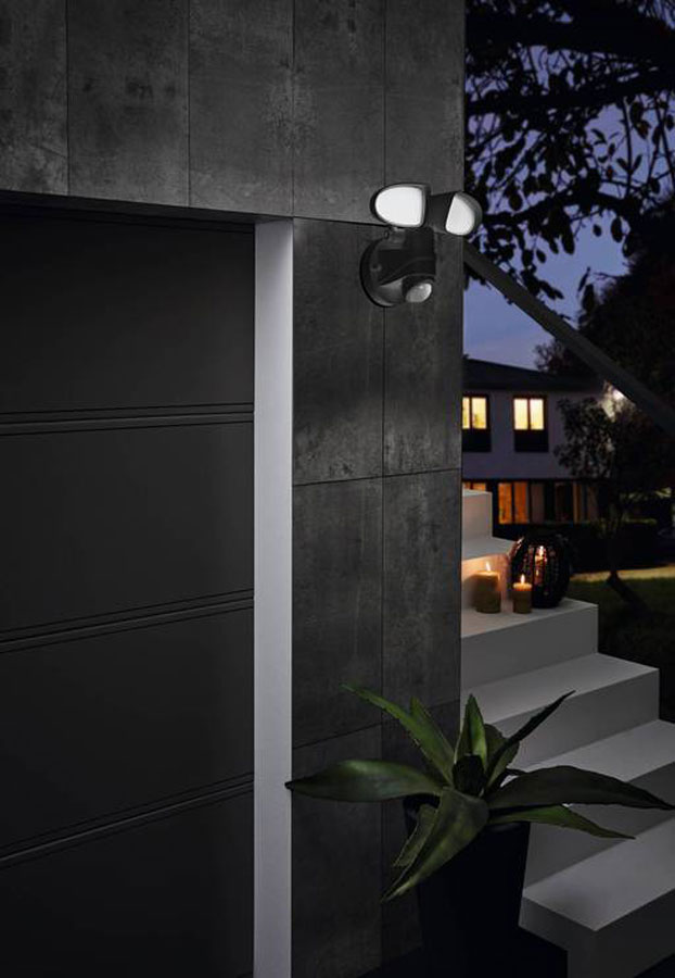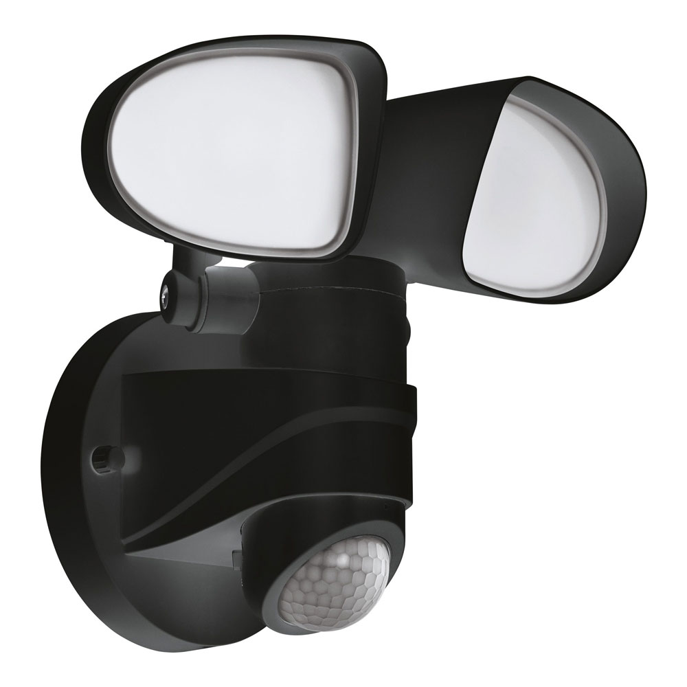 Черен LED фасаден аплик, изработен от пластмаса с вграден сензор за движение и две подвижни глави Eglo, серия Pagino.