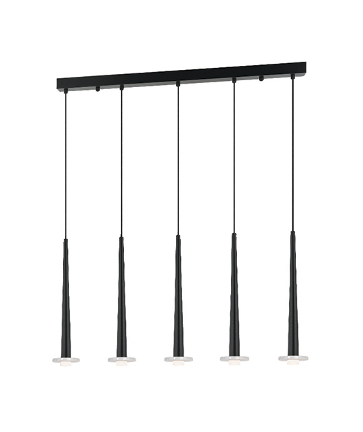 Модерен черен LED пендел, изработен с правоъгълна метална основа и пет метални тела с конусовидна форма, Zambelis.