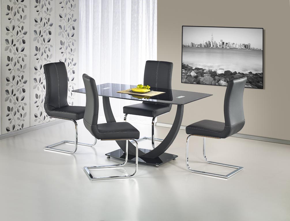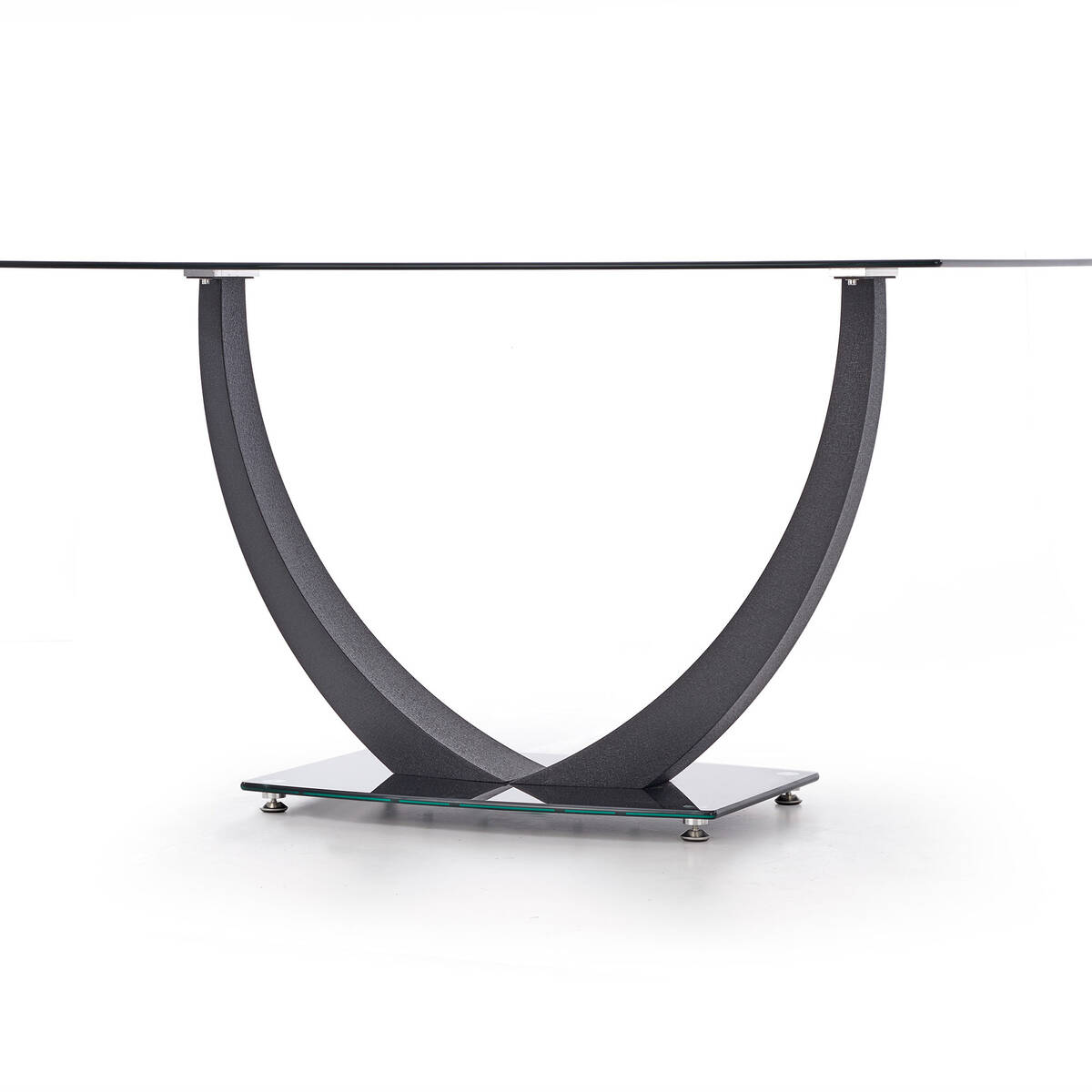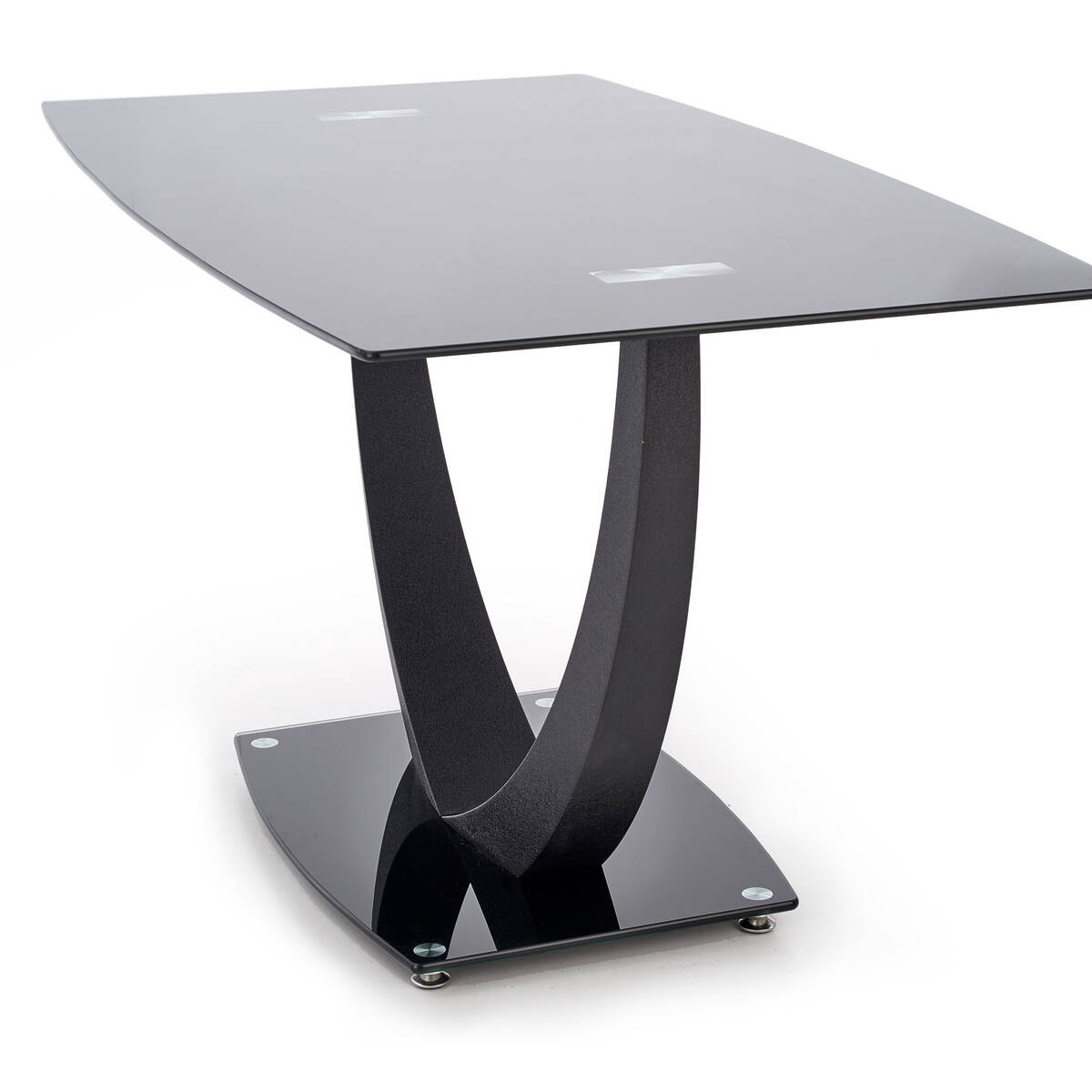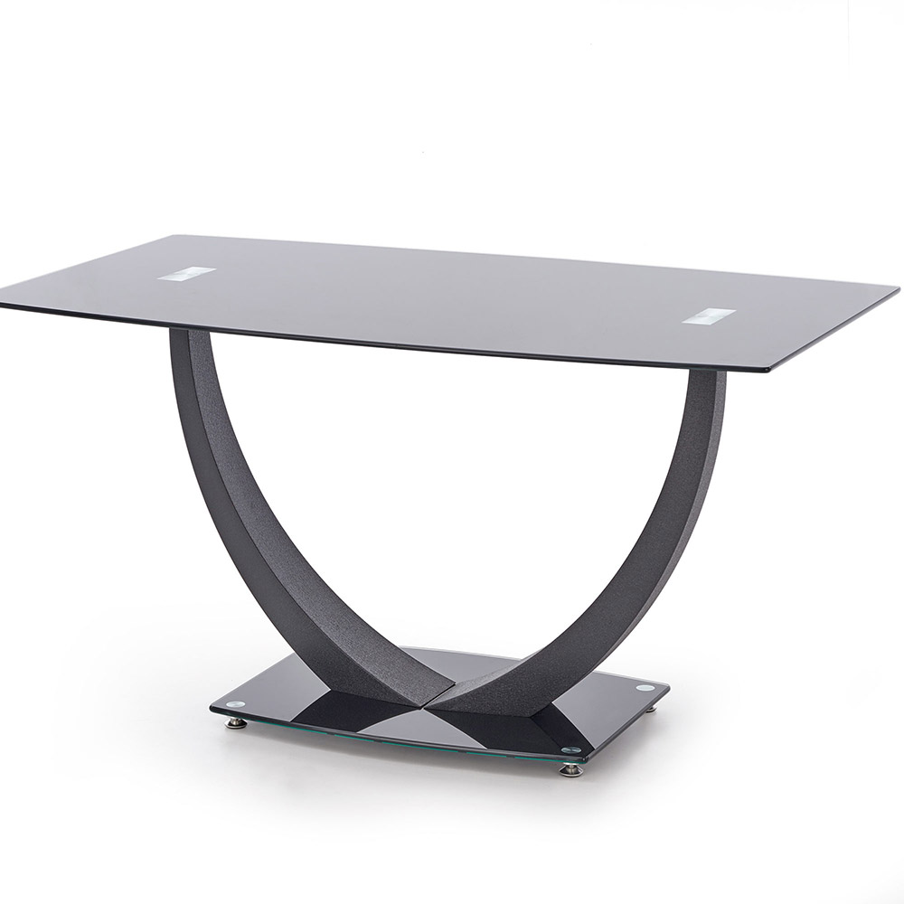 Трапезна маса със стъклен плот и боядисана стоманена основа Анри. Предлага интересна форма и атрактивна визия в черен цвят.