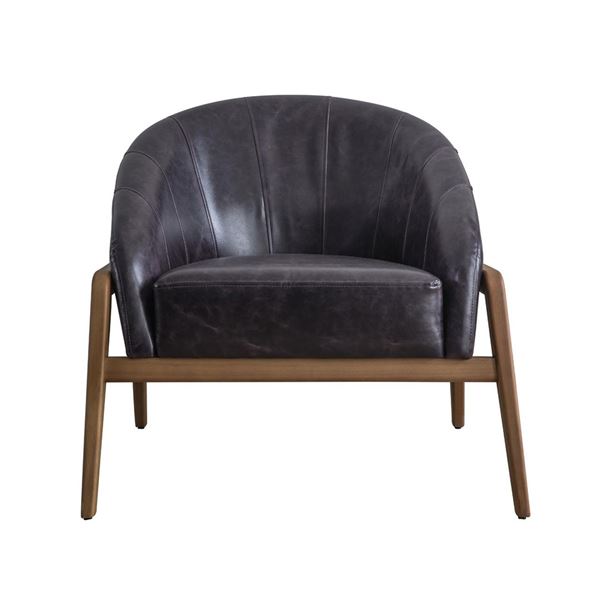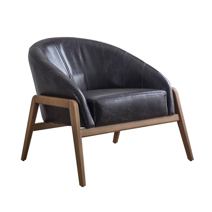 Черно кожено кресло в овална форма, изработено с дървена рамка от масивен бук в натурален цвят и висококачествена еко кожа.