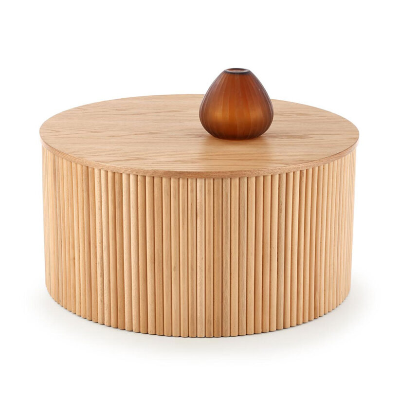 Цилиндрична холна маса с основа от летви масивно дърво и кръгъл МДФ плот покрит с естествен фурнир.