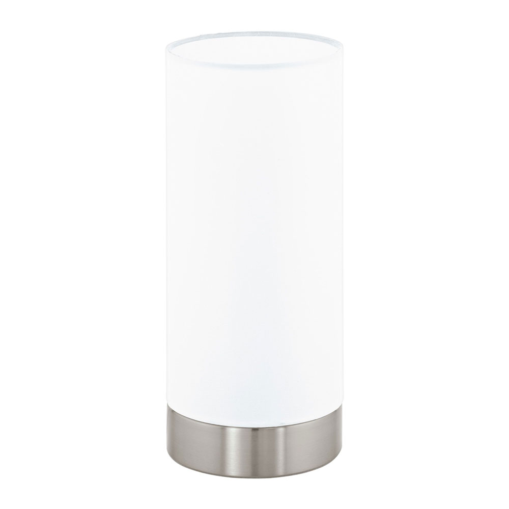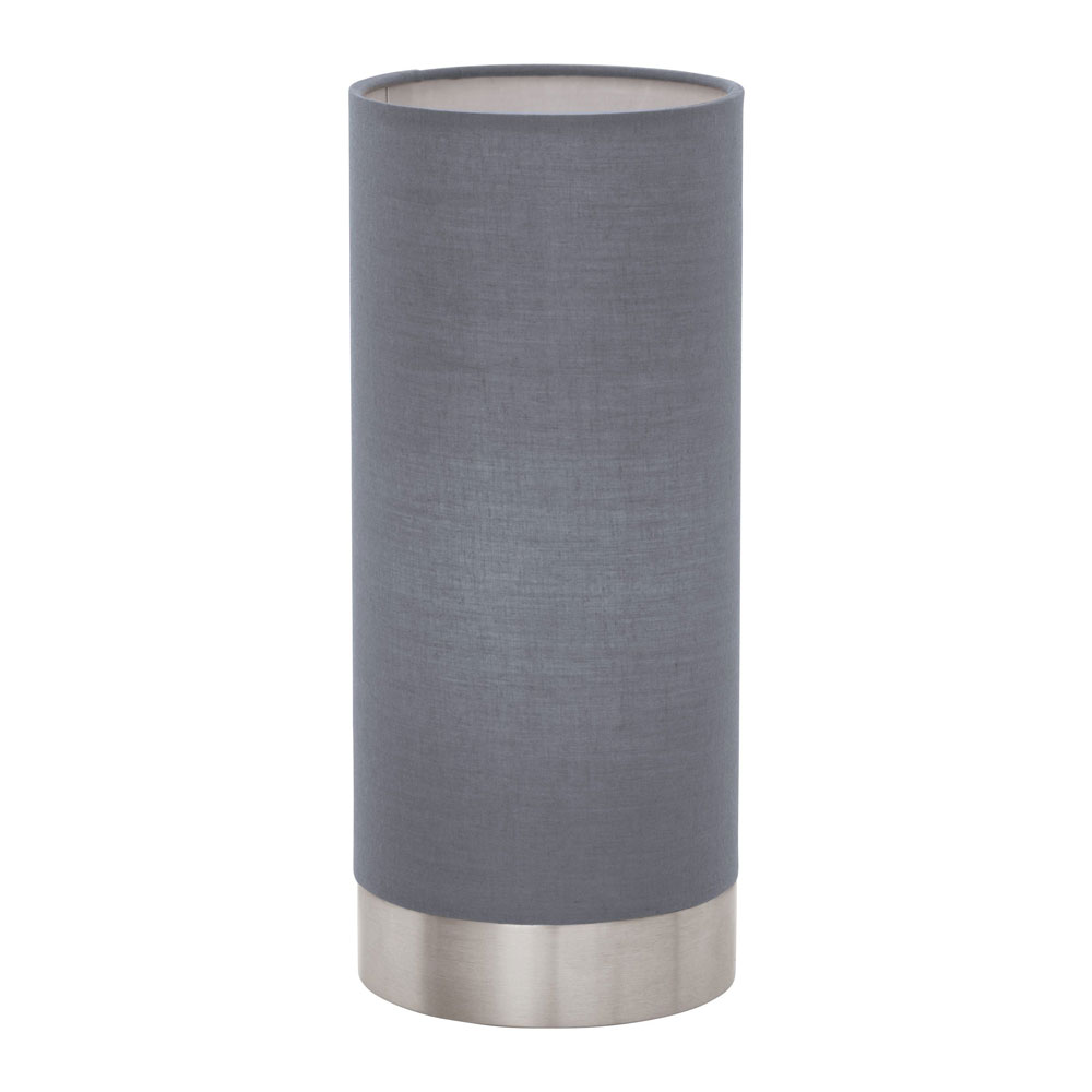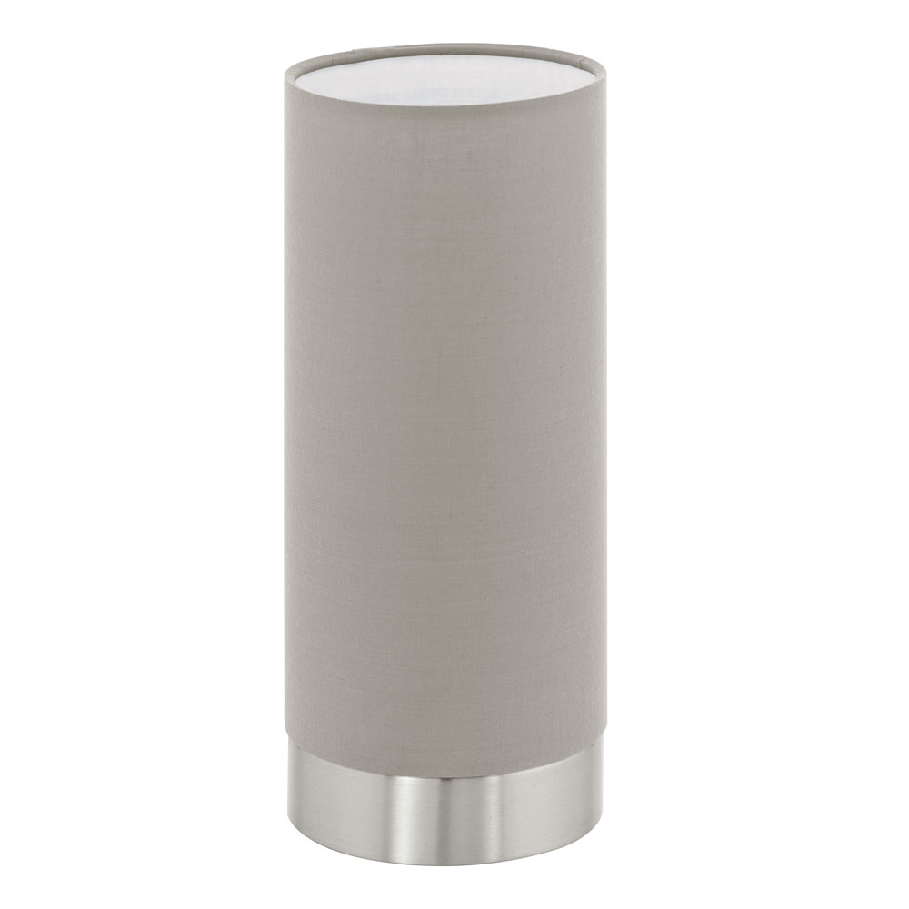 Цилиндрична настолна лампа с основа от стомана в цвят никел мат и текстилно тяло и тъчдимер, Eglo, серия Pasteri.