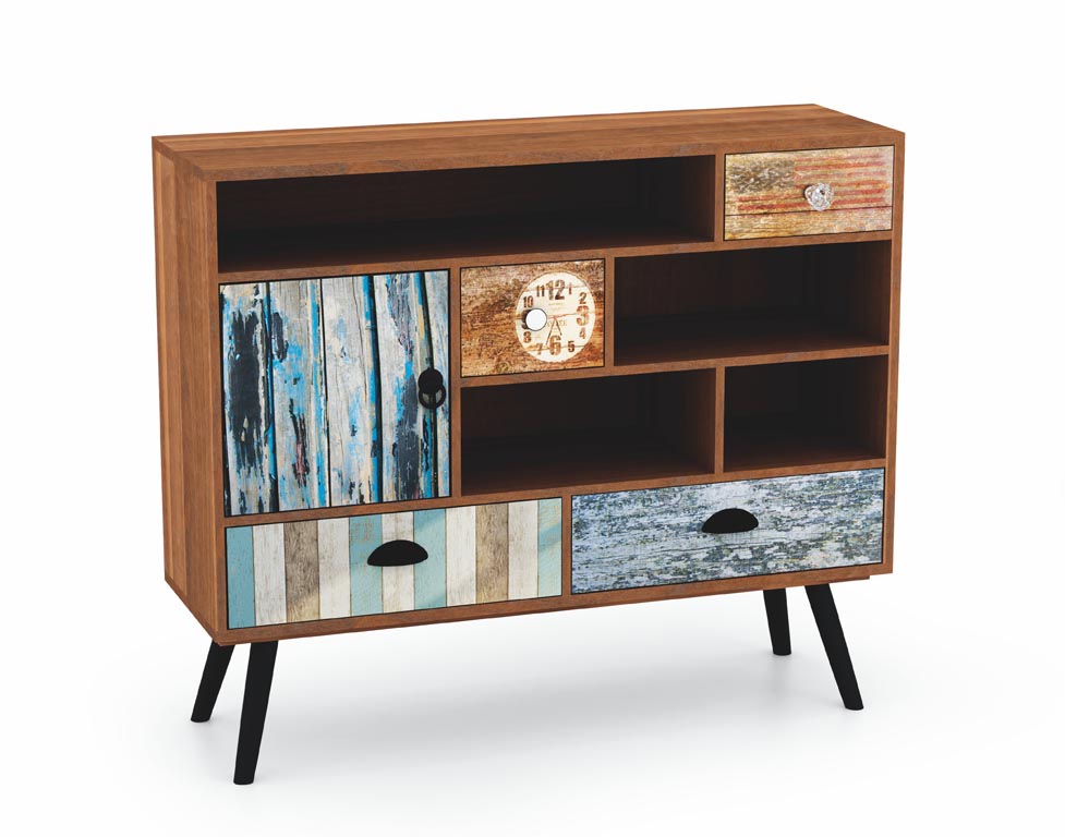Правоъгълен дървен шкаф с чекмеджета, рафтове и малко шкафче с вратичка, всички с различен цвят.