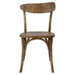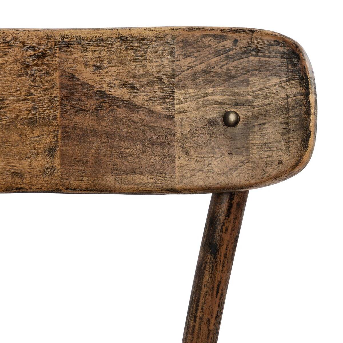 Трапезен дървен стол, изработен от състарена дървесина с ретро ефект и извити орнаменти под седалката.
