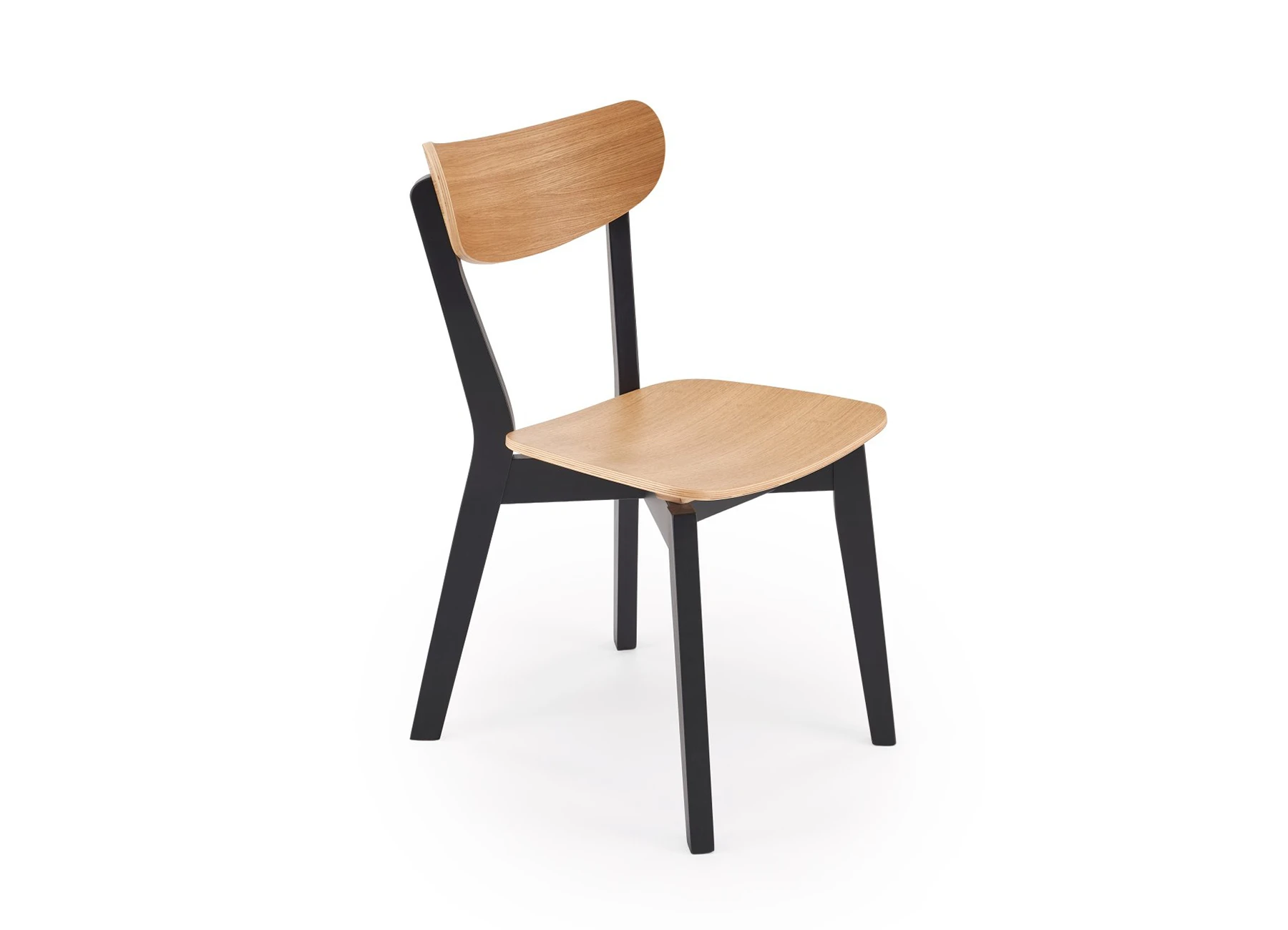 Седалката и облегалката са изработени от огънат шперплат в натурален дървесен цвят, а конструкцията и краката са от масивен дъб в универсален черен цвят за лесно съчетаване с различни маси.