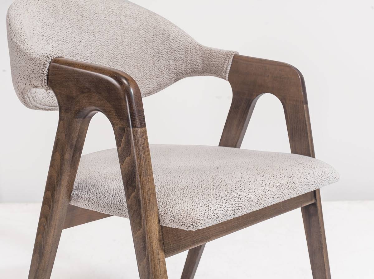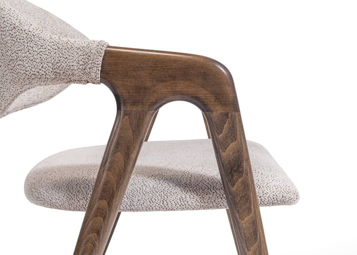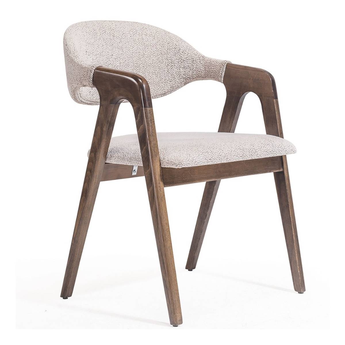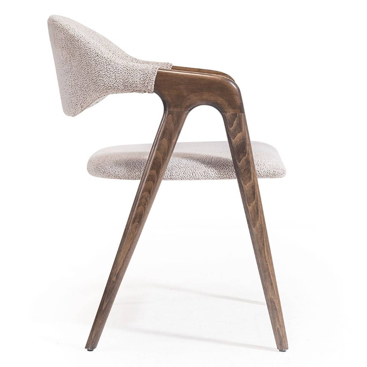 Стилен дървен трапезен стол, изработен с основа от бук в цвят орех и бежова текстилна дамаска.