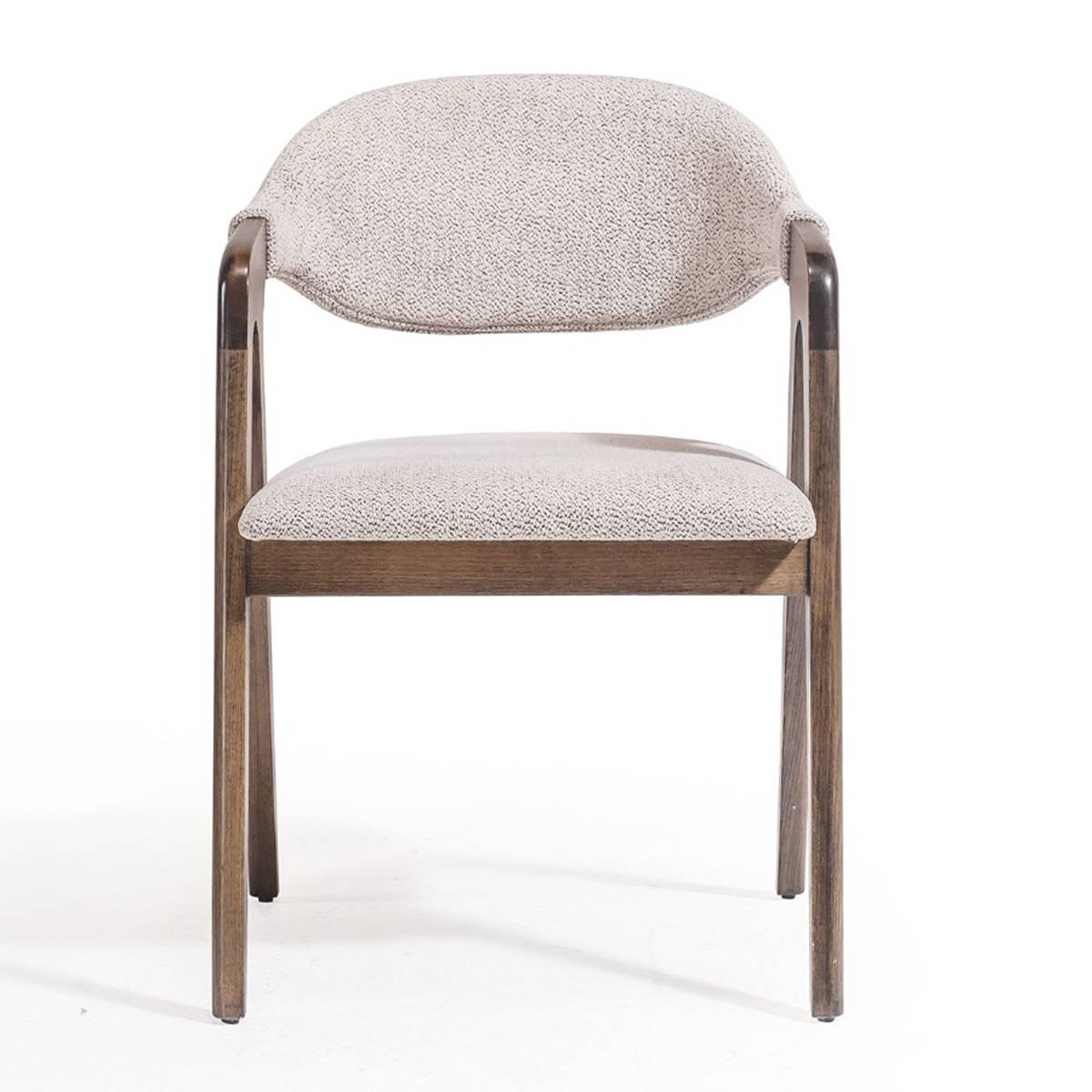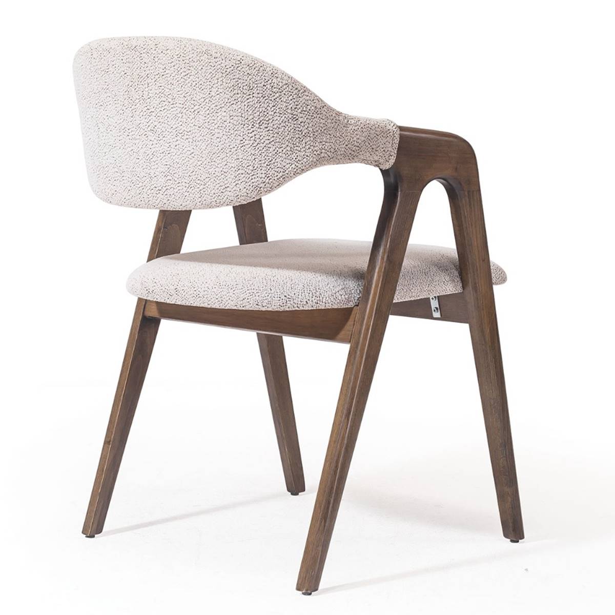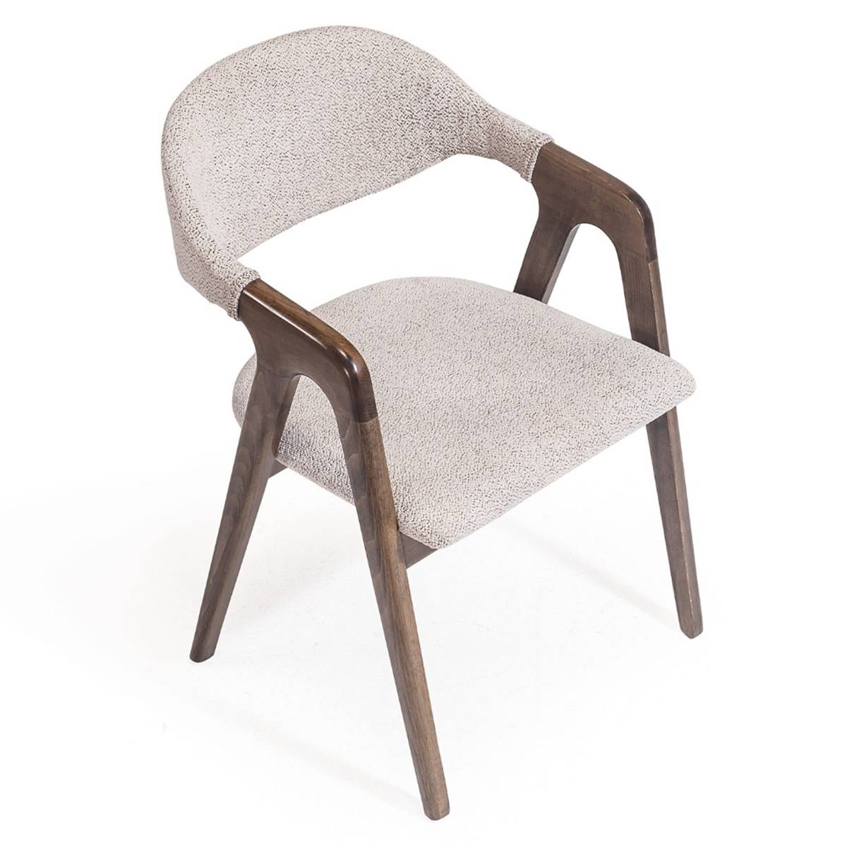 Стилен дървен трапезен стол, изработен с основа от бук в цвят орех и бежова текстилна дамаска.