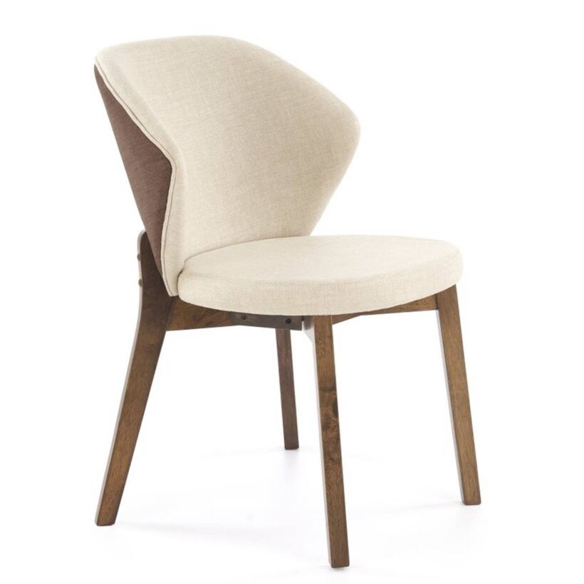 Елегантен дървен трапезен стол с текстилна дамаска в бежово и основа в цвят орех.