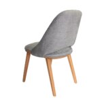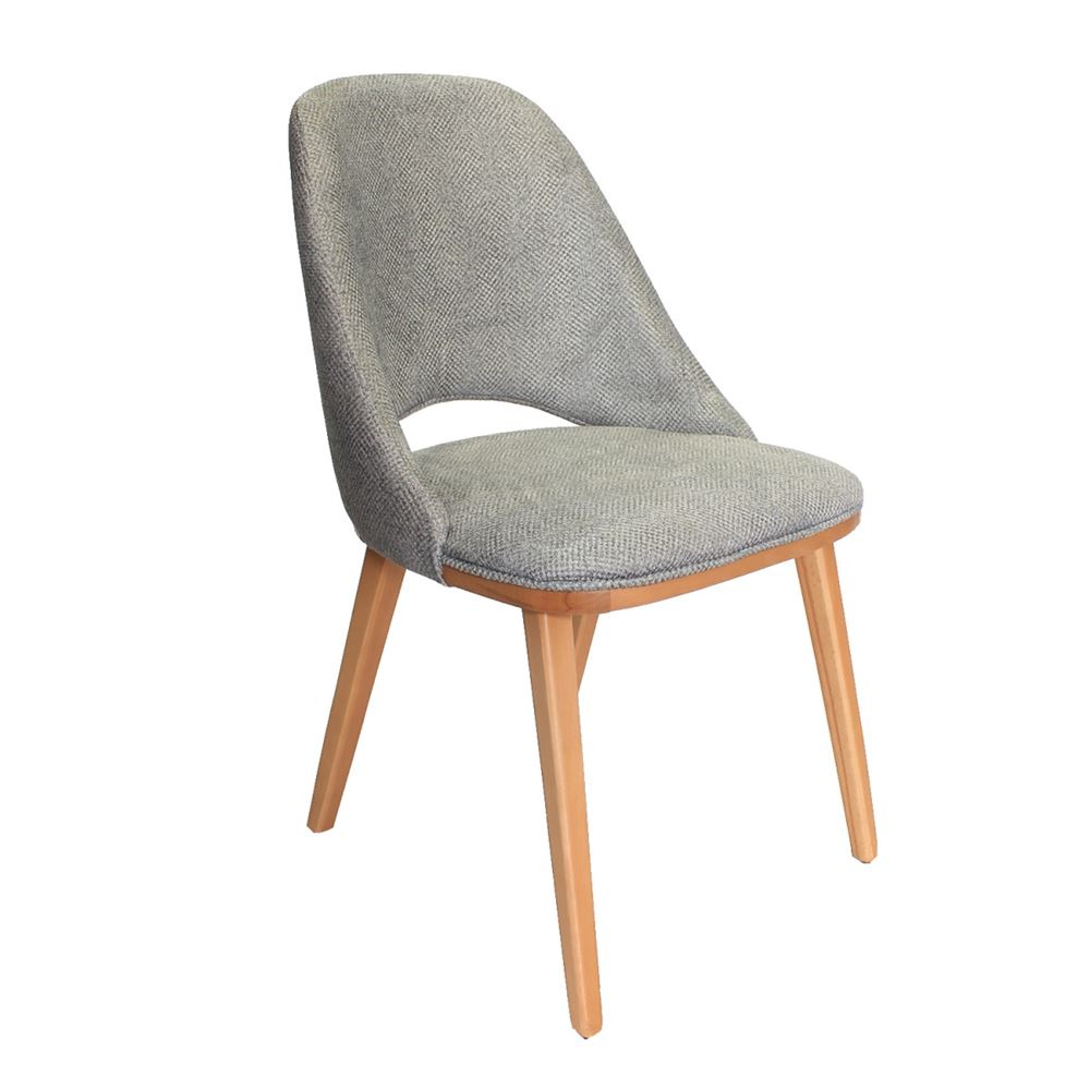 Дървен трапезен стол, изработен с основа в цвят натурален дъб, комфортна облегалка с изрязан детайл на гърба и мека текстилна тапицерия в два цвята – сив и черен.