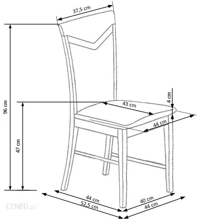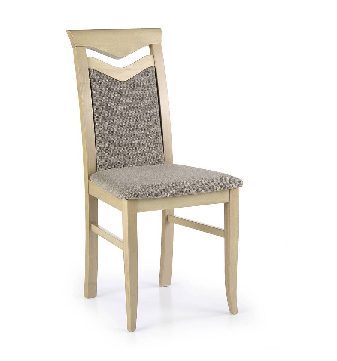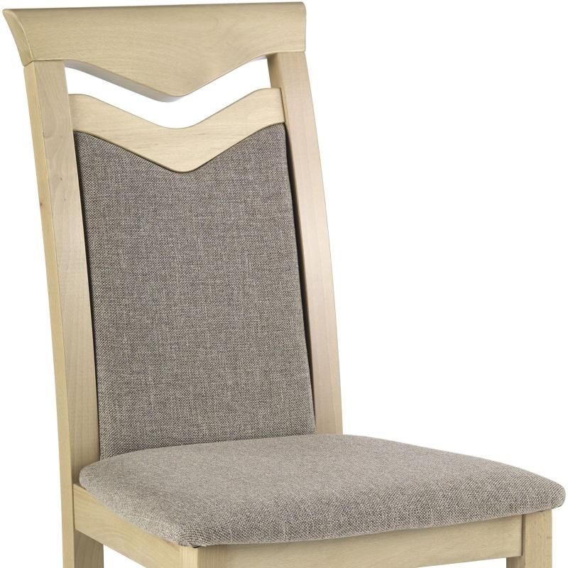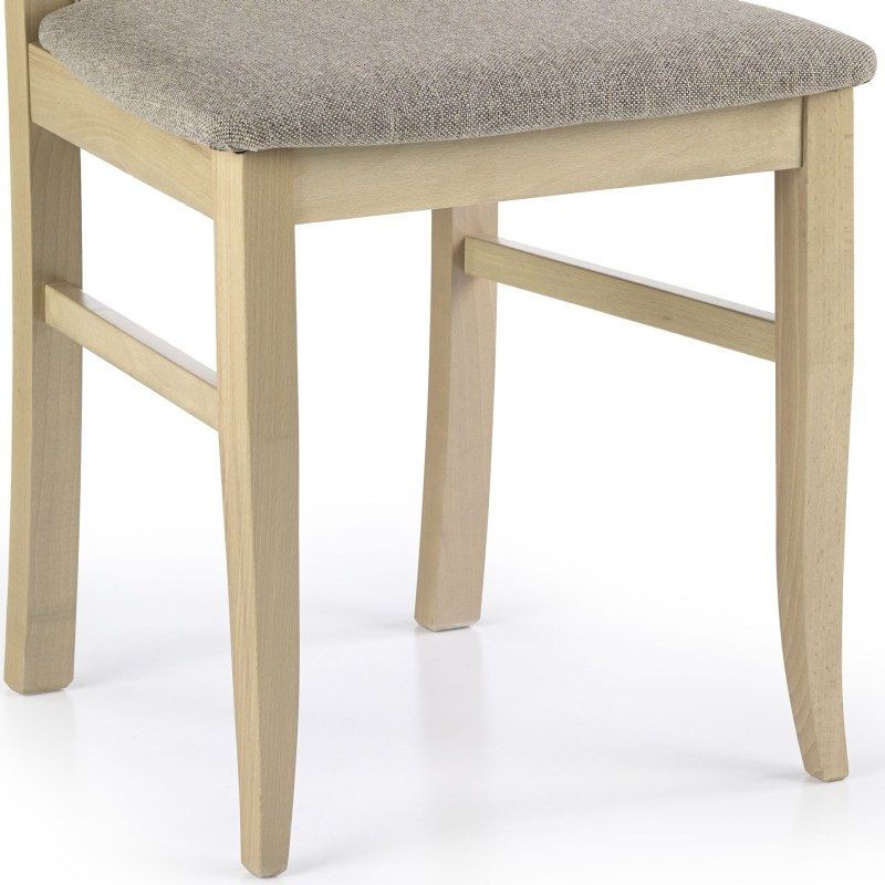 Дървен трапезен стол от масив (бук), боядисан в светъл цвят с текстилна дамаска на седалката и облегалката в бежово.