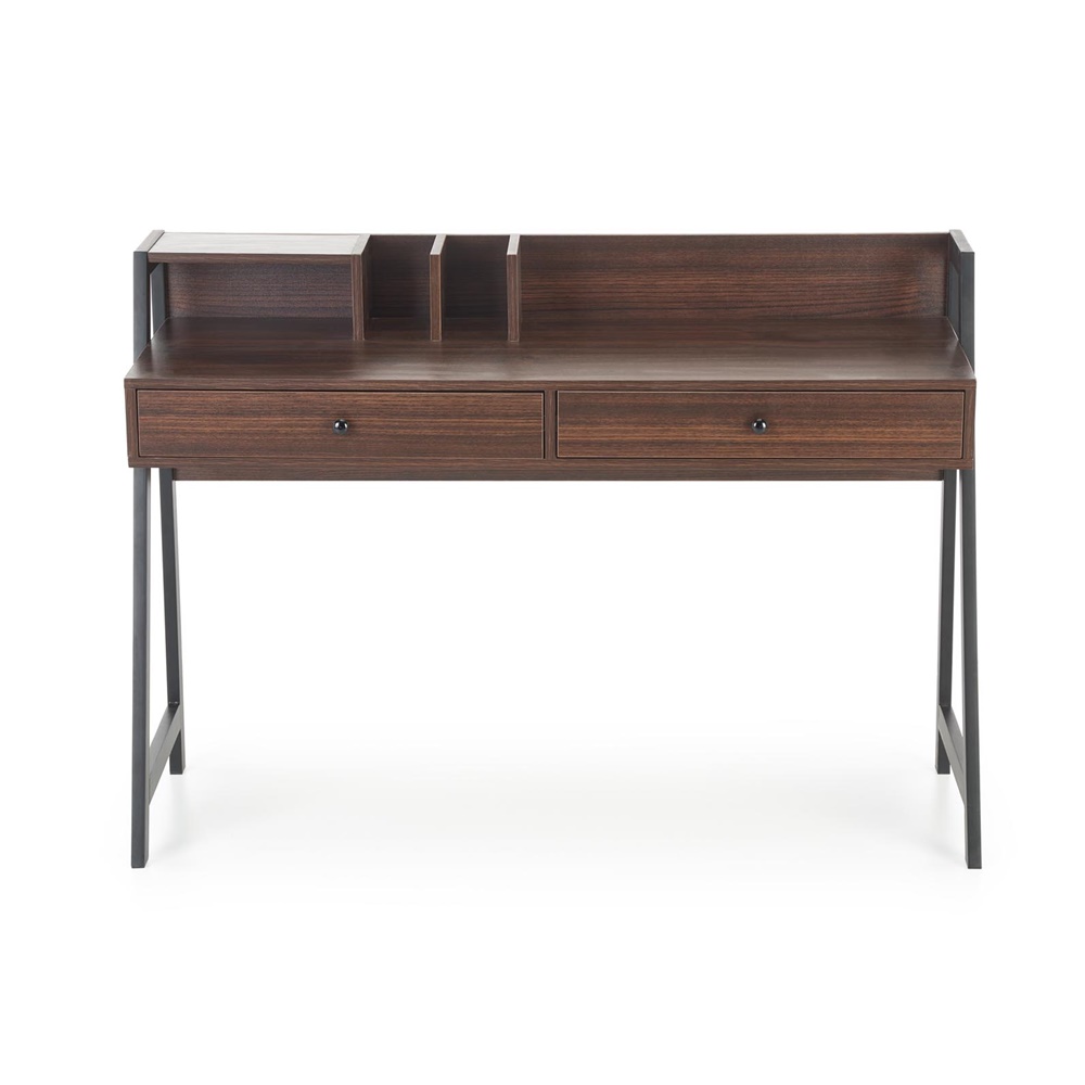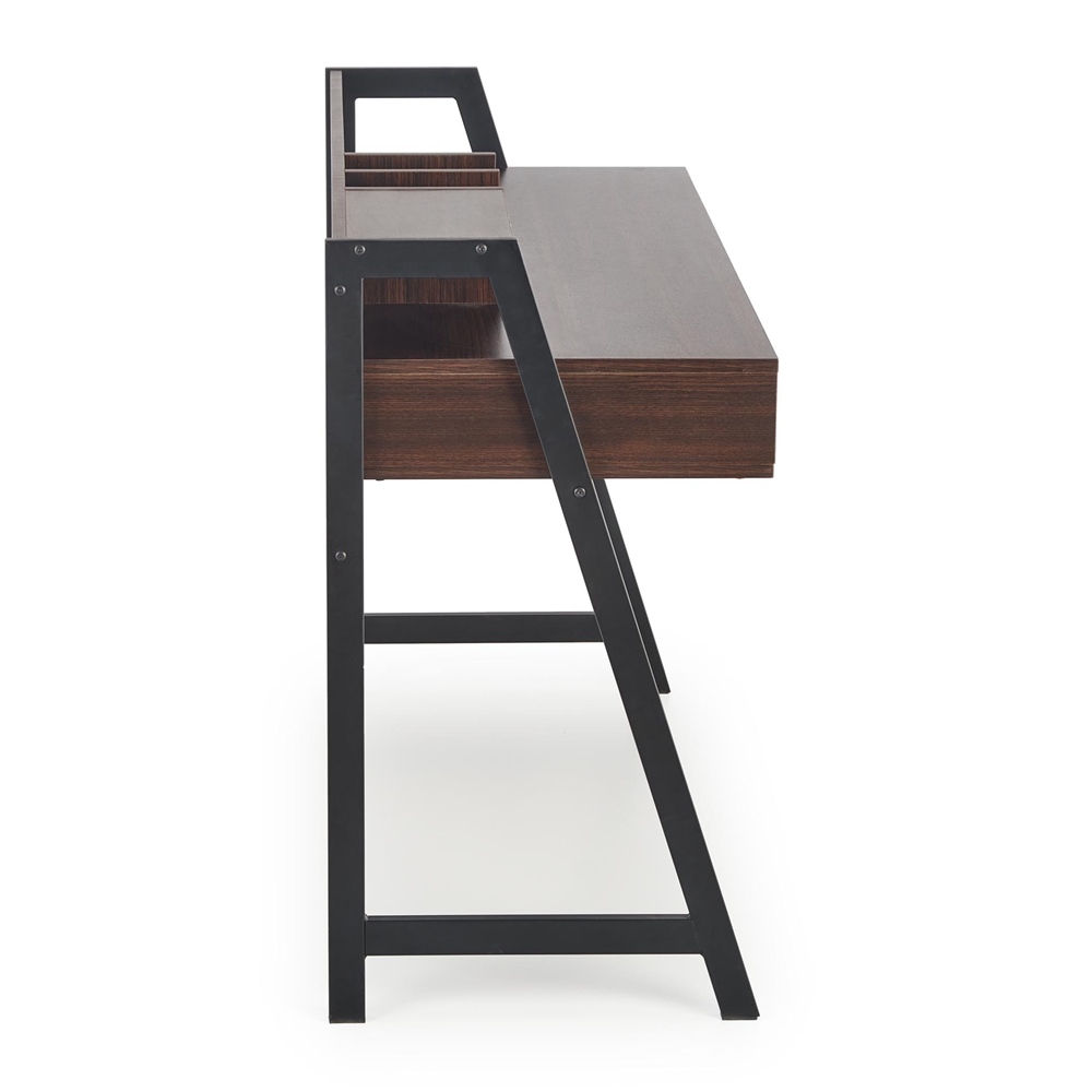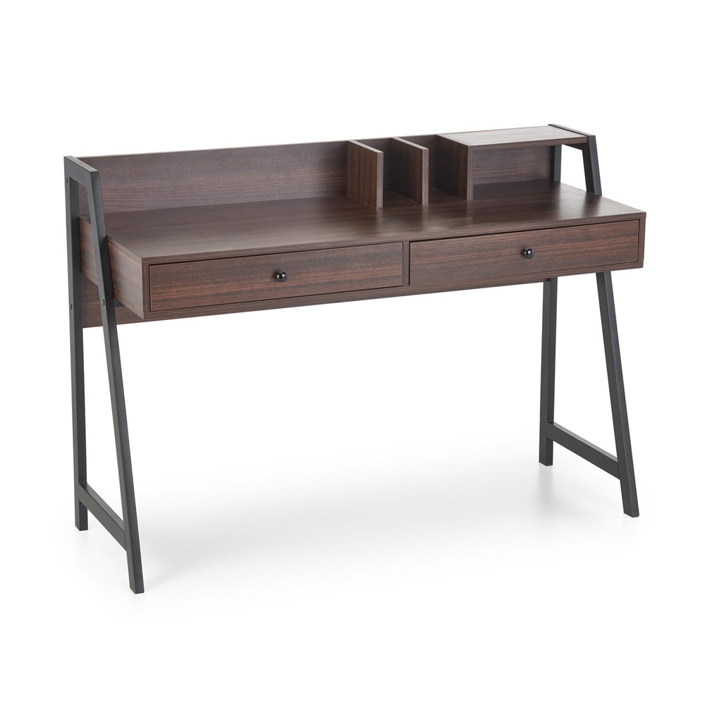 Модерна дървена конзолна маса с плот, две чекмеджета и рафт от ПДЧ с меламиново покритие в цвят орех и черна метална основа.